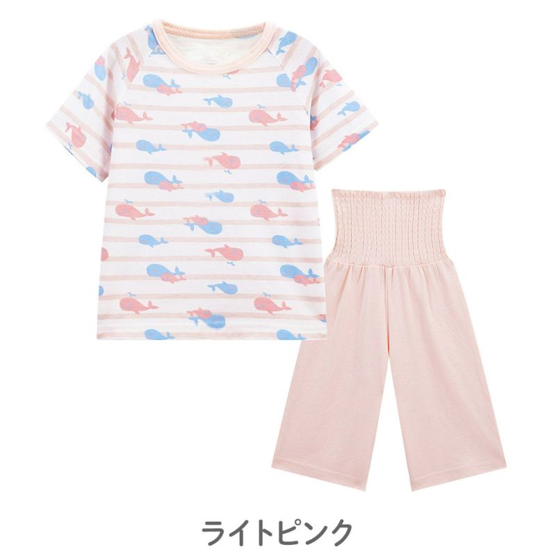 【柄】ライトピンクとミントグリーンは、ボーダー柄の間を仲良く泳ぐ親子クジラをさわやかな色合いで表現しました。サックスは、クマがカヤックやビーチフロートなど楽しく水遊びをする柄で、夏らしく清涼感あふれる一品です。ピンクカラーは、女児に人気のイチゴを水玉やハート柄でかわいらしく表現したポップなイメージの柄です。グリーンはキッズに人気の恐竜柄で、T-Rex やトリケラトプスなどの総柄パンツと、T-Rex、ステゴザウルス、プテラノドンの大きな柄を前身頃にプリントしたトップスを組み合わせたインパクトのある一品です。