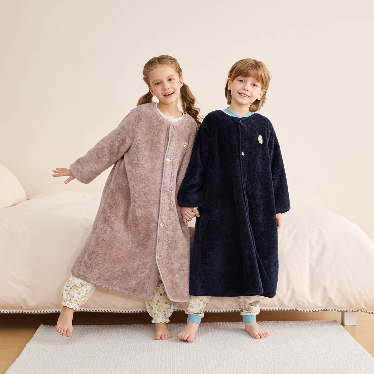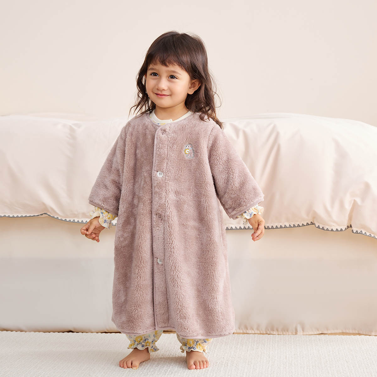 【仕様】ボリュームたっぷりな、毛足の長い両面ボアフリースのスリーパーはガウンにもなって、とってもあったか。裾にはずり上がり防止ボタン付きでめくれを防止します。ボタンホールを斜めにしてボタンを留めやすくしました。