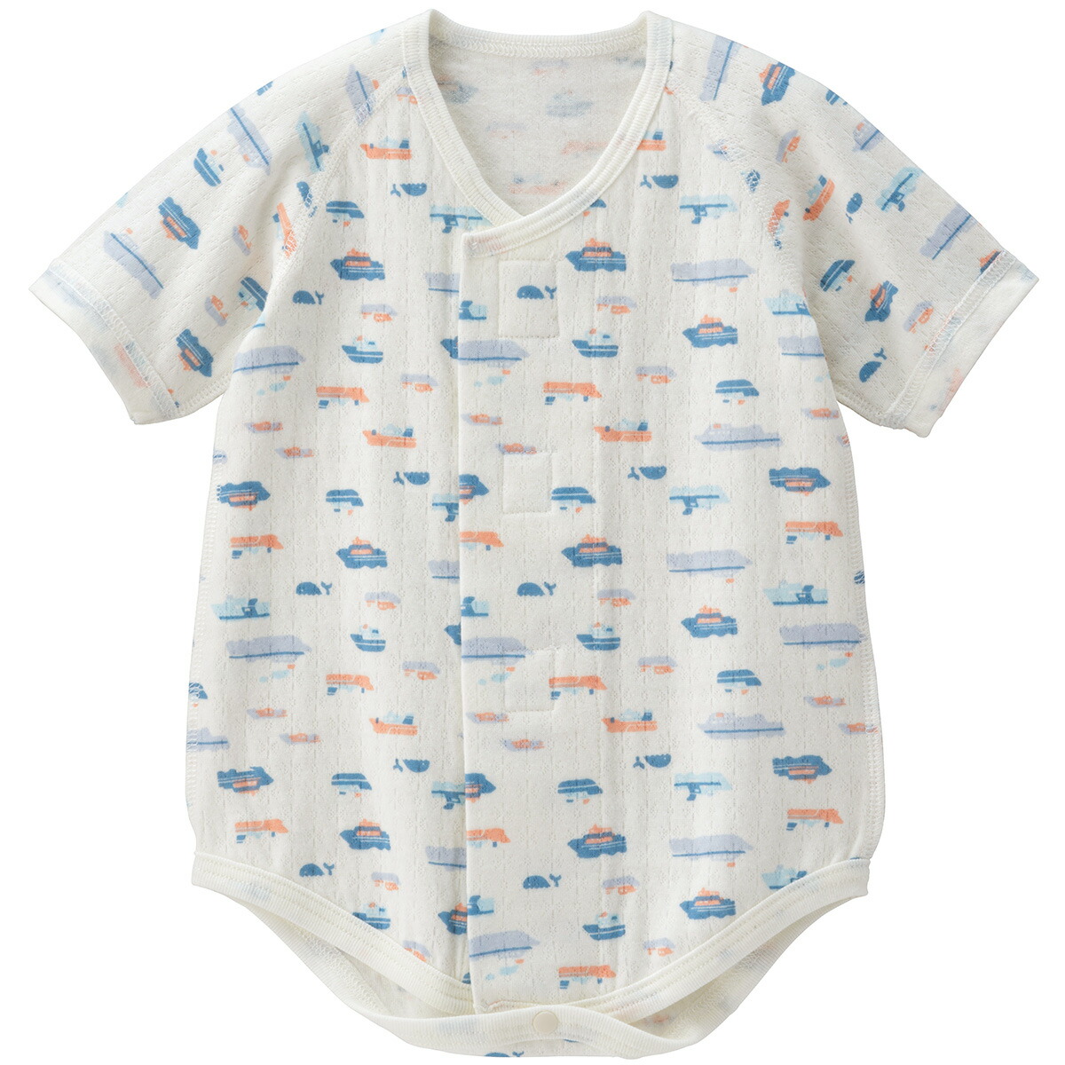 やさしい色合いの船とくじらの柄が可愛らしい、綿100%エアーニット素材の新生児用肌着です。生地と生地の間に空気を含むので、ふんわりやわらかく、ほどよい温もりが心地いい。フロントはワンタッチテープなのでサッとなでるだけでお着替えラクチン、赤ちゃんが動いてもお腹が出ないずり上がり防止ボタン付きです。