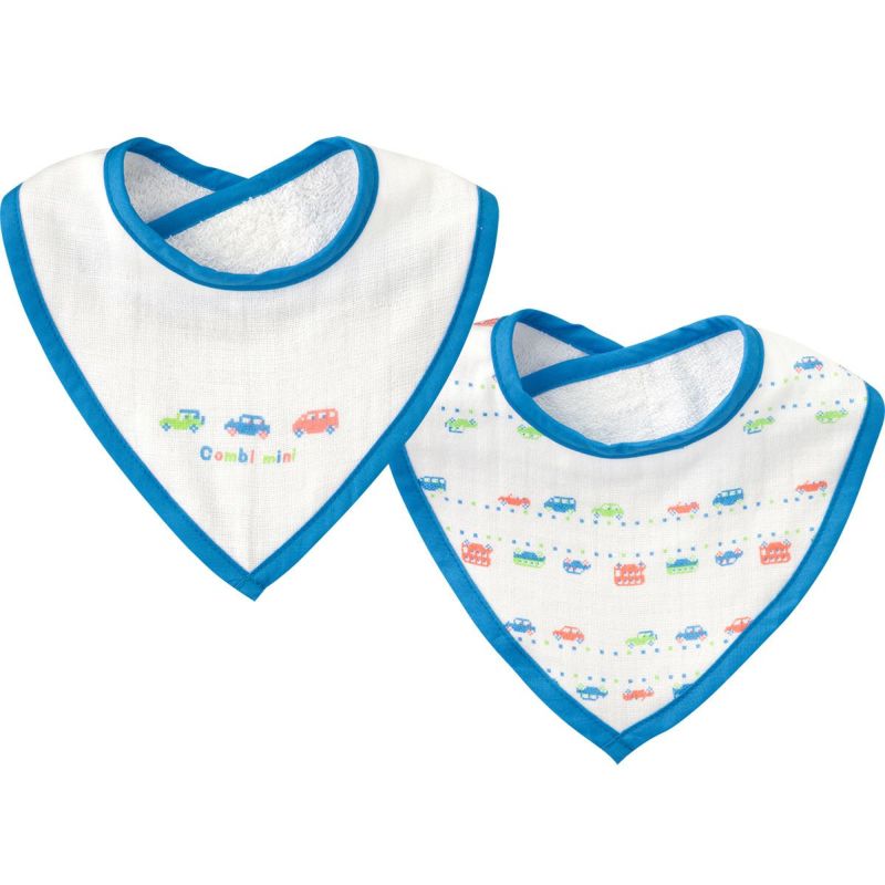 洗い替えに便利なバンダナスタイのセットです。表はガーゼ、裏はタオルの綿100%で、肌触りなめらかでやわらかい安心の素材。男の子が大好きなバスやオープンカーなどを、かわいらしいタッチで並べたピコピコ車柄です。