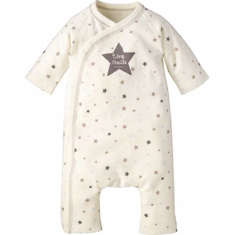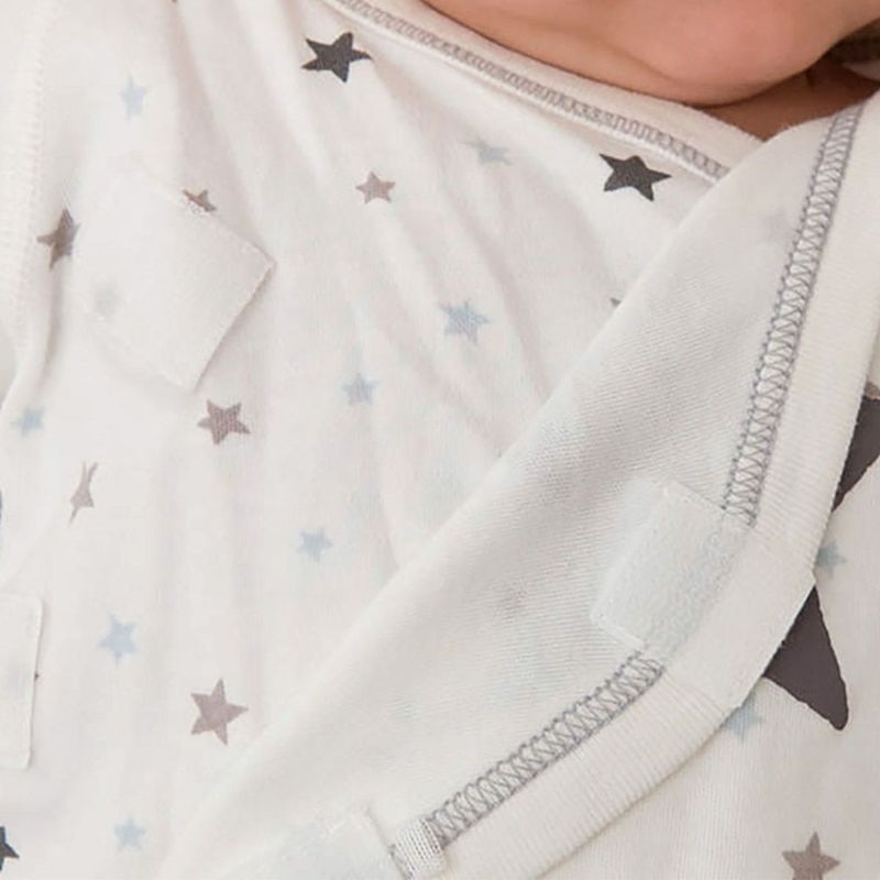 肌ざわりスムースな超柔綿だからベビーもリラックス。モノトーンの星をちりばめたシンプルで飽きのこないデザインです。衿ぐりから裾のバインダーには飾りステッチをほどこしました。3シーズン使えます。
