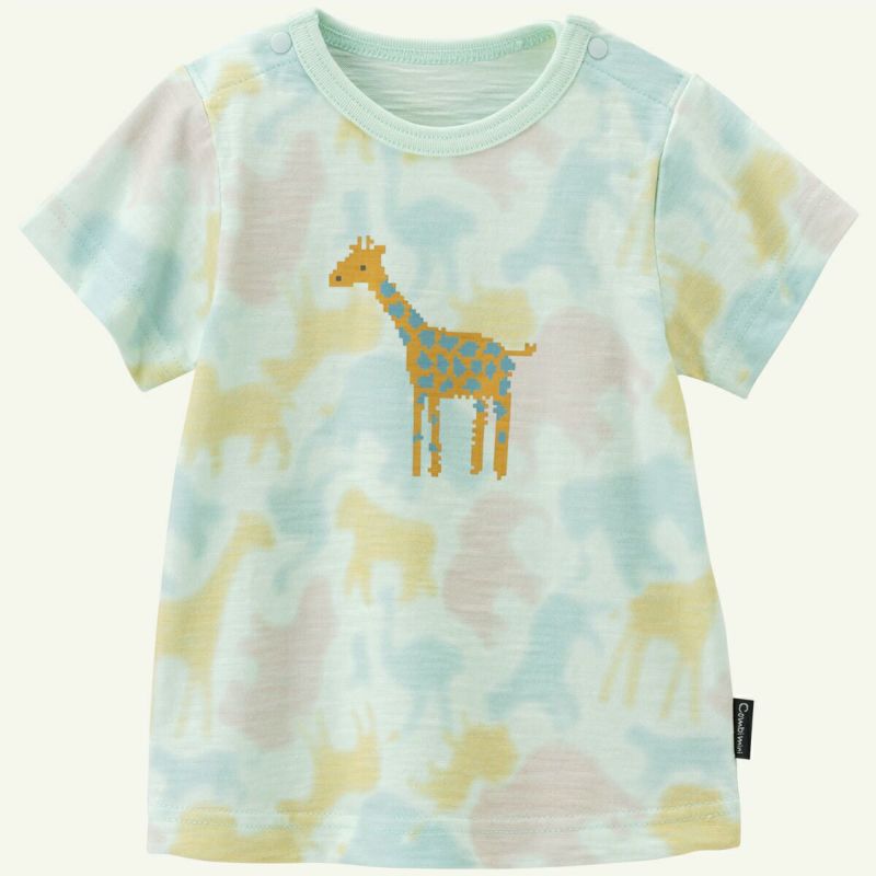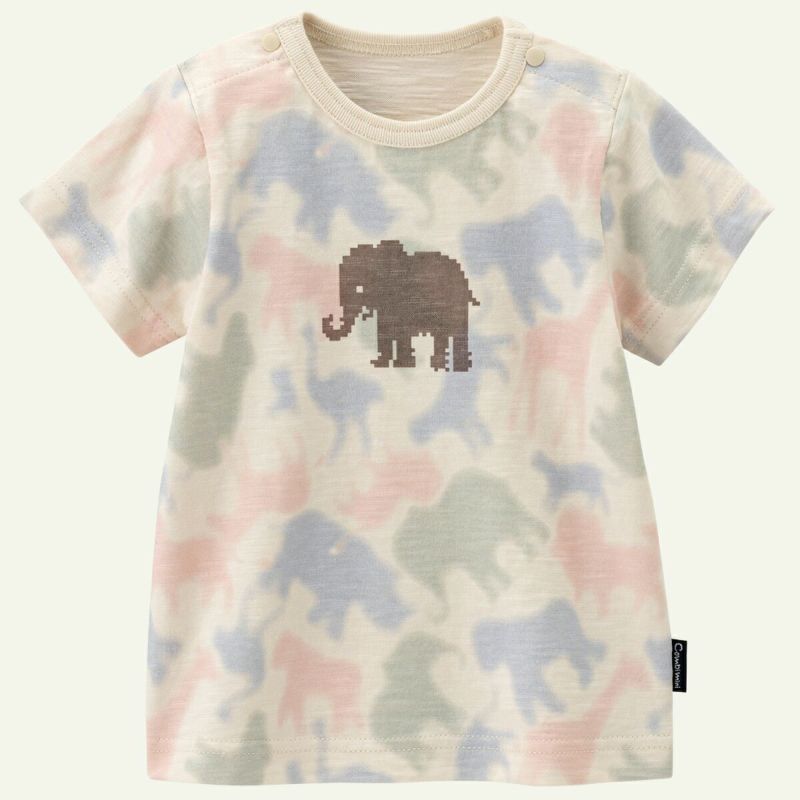 ダチョウやサイ、ゴリラ、チーターなど様々な動物をタイダイ染め風のアニマルカモフラージュで表現した柄がおしゃれな半袖Tシャツ。さらっとした肌触りと表情のある綿100%スラブ天竺で、ナチュラルなヴィンテージ感もカッコイイ。アイボリーにはゾウ、ミントグリーンにはキリンのピクセル風モチーフをプリントしました。キッズアイテム(品番