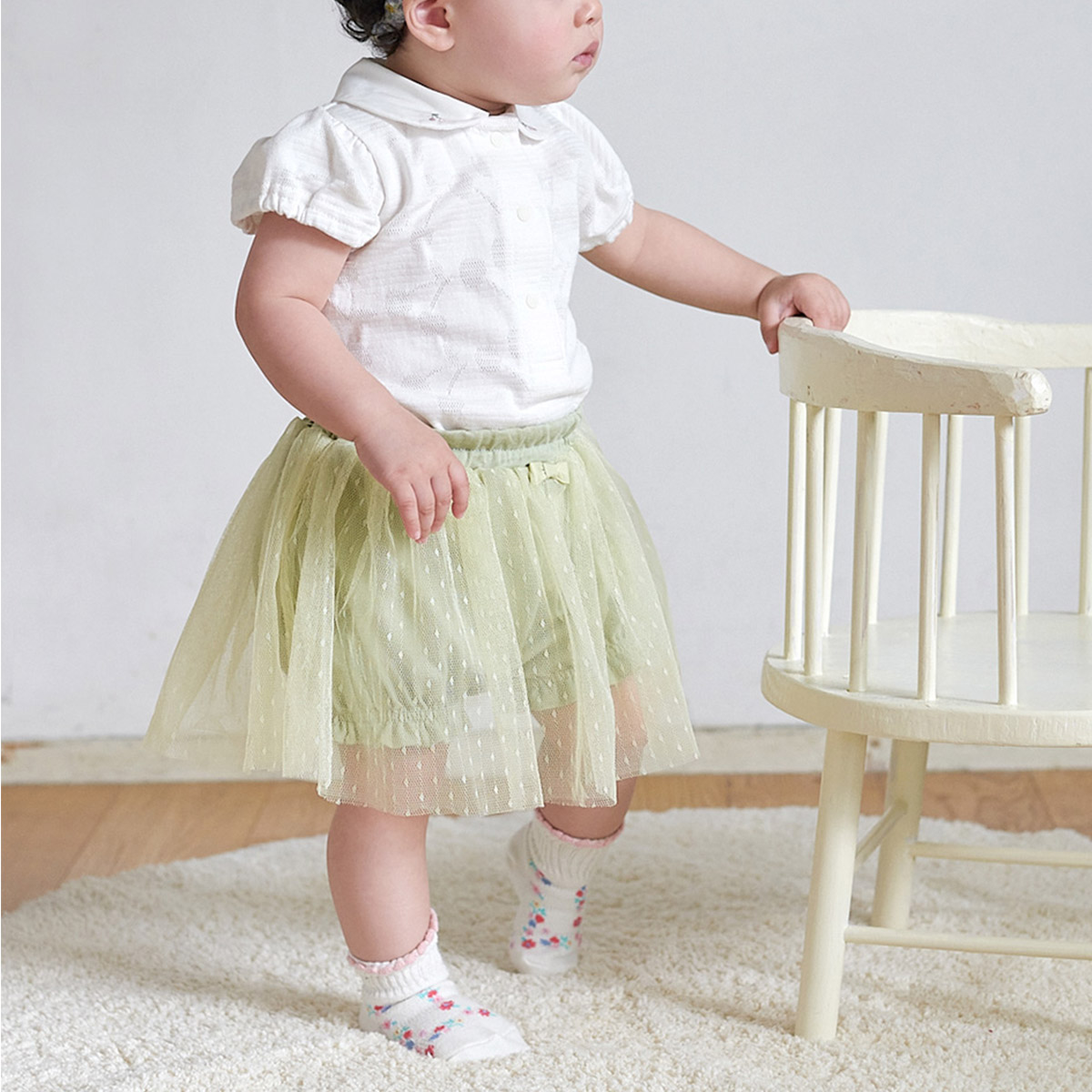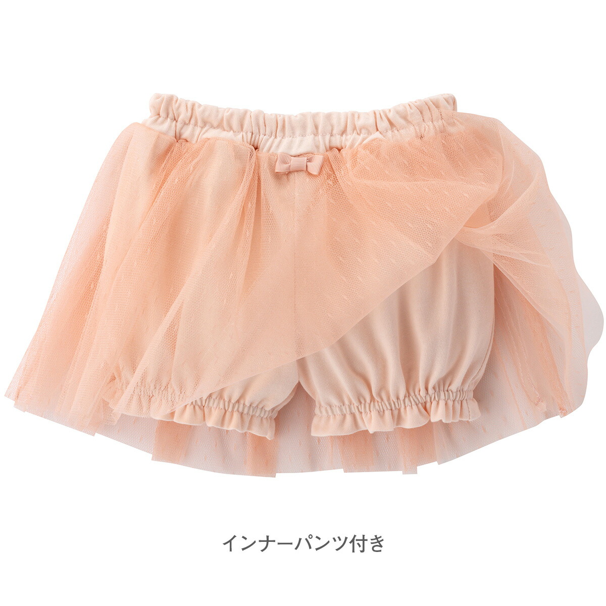 ベビーのかわいらしさをMAXに引き出してくれるチュールスカートです。スカート部分は無地チュールとドット柄チュールの2枚重ねでふんわりひらり。同色インナーパンツは肌触りのよいベーシックな綿100%の天竺素材なので着心地も抜群。淡い色使いで春夏らしいガーリーな装いが完成します。前後がひと目でわかるウエストリボン付きなのもうれしいポイントです。
