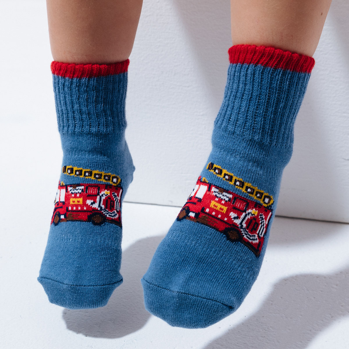 男の子に大人気な働く車をモチーフにしたシューフィットソックス。ブルーは消防車、杢グレーはブルドーザーが甲部分に登場します。つま先部分は厚地で敗れにくく、足裏の滑り止めなどキッズにうれしい工夫も満載。