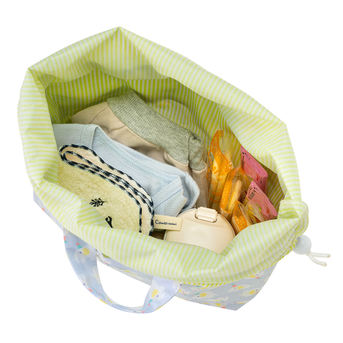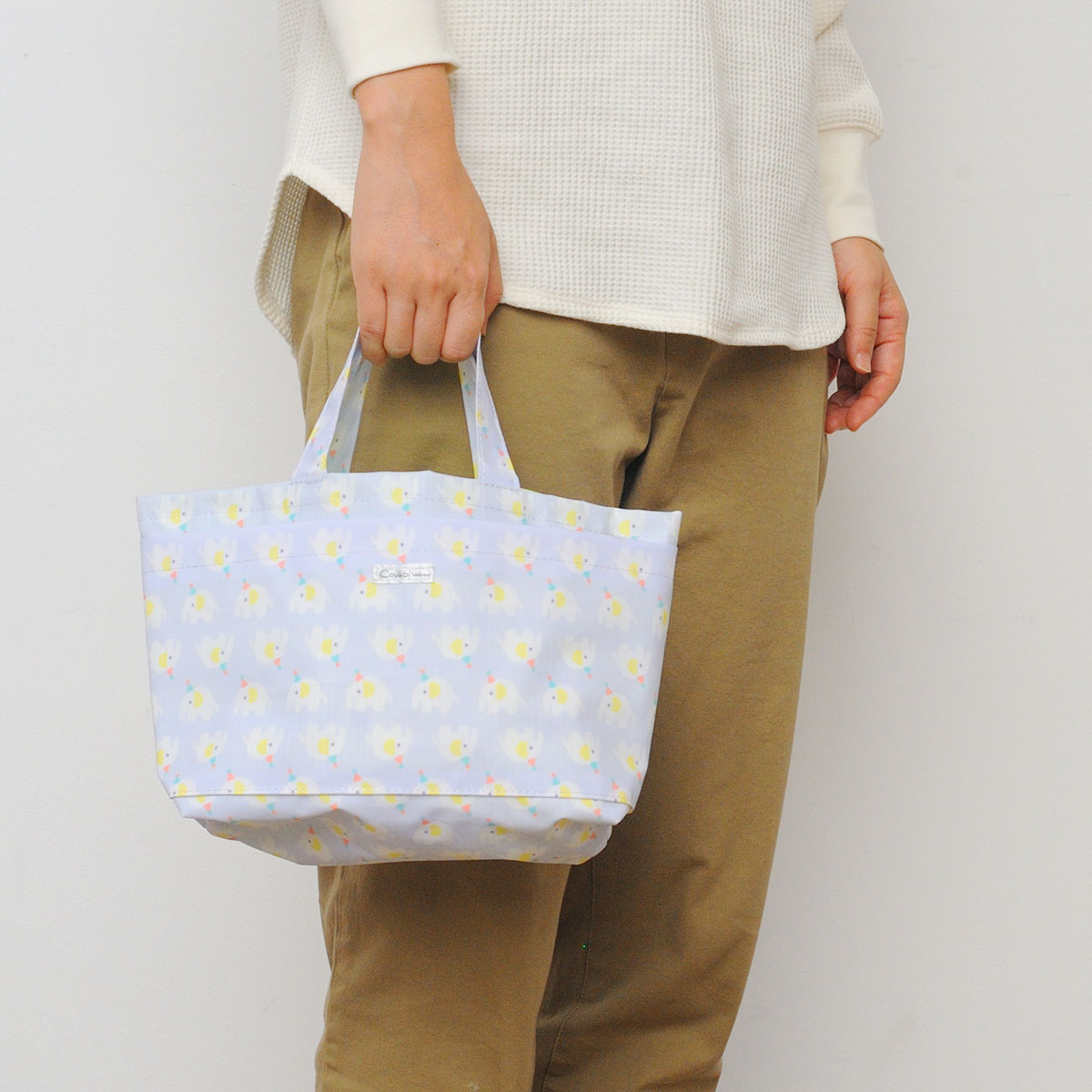 ランチバッグとして使ったり、お着替えを入れたり、マグやおやつを入れたり..いろいろな用途で使えて重宝するちょうどいいサイズのトートバッグ。三角帽子をかぶった可愛らしいぞう柄と、キュートないちご&うさぎ柄の2柄で、内側はストライプです。表面は撥水効果のあるEVA素材なので、汚れがつきにくいところも嬉しいポイント。外側にはサッとウェットティッシュが取り出せる専用ポケット付き。