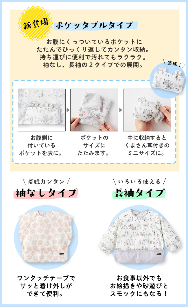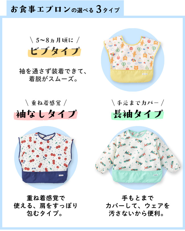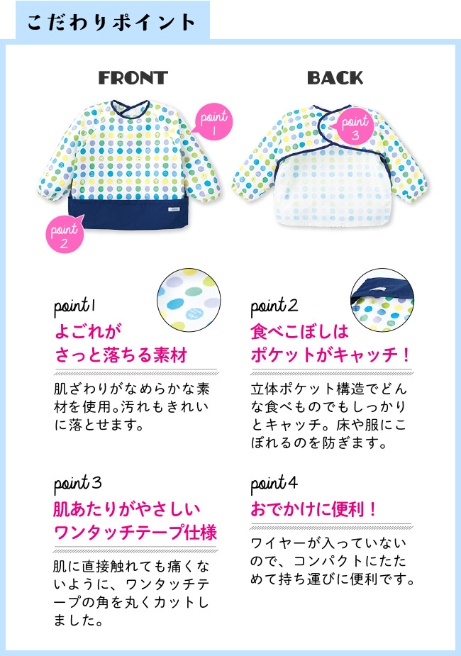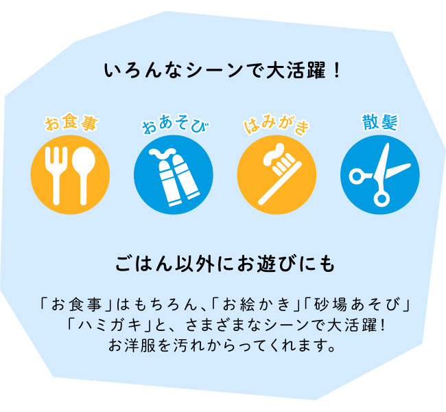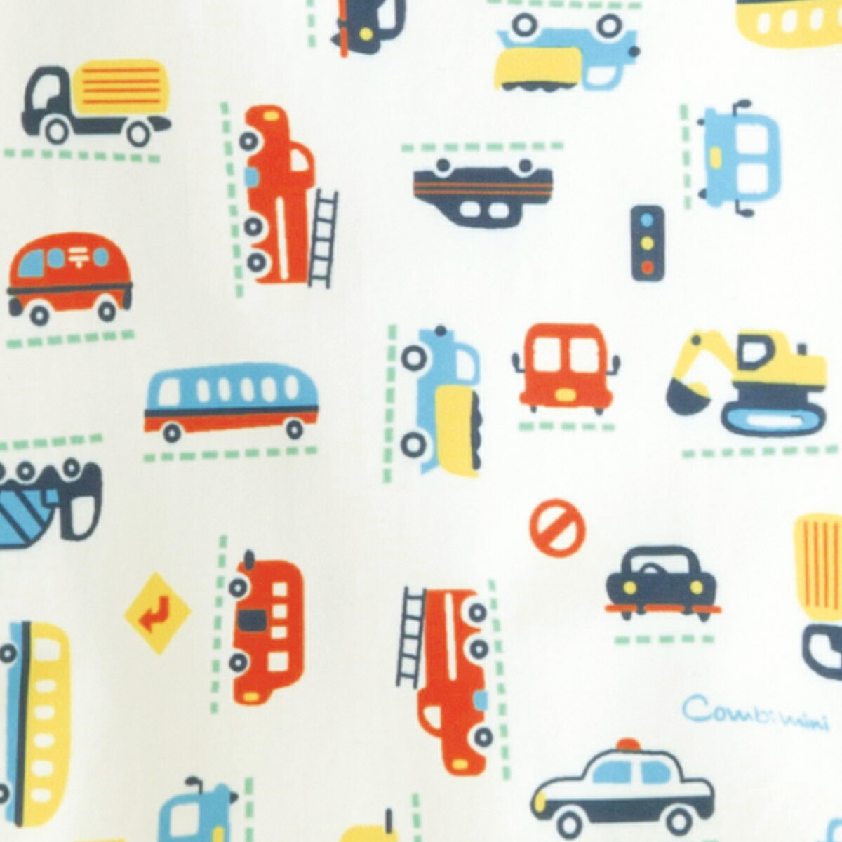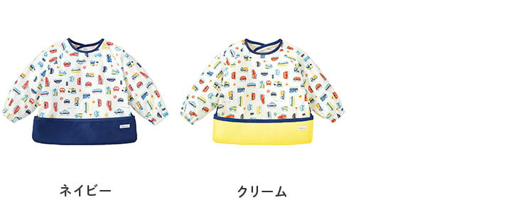 パトカーやトラックなど、はたらく車をプリント。男の子がすすんで着てくれて、汚れをシャットアウトします。