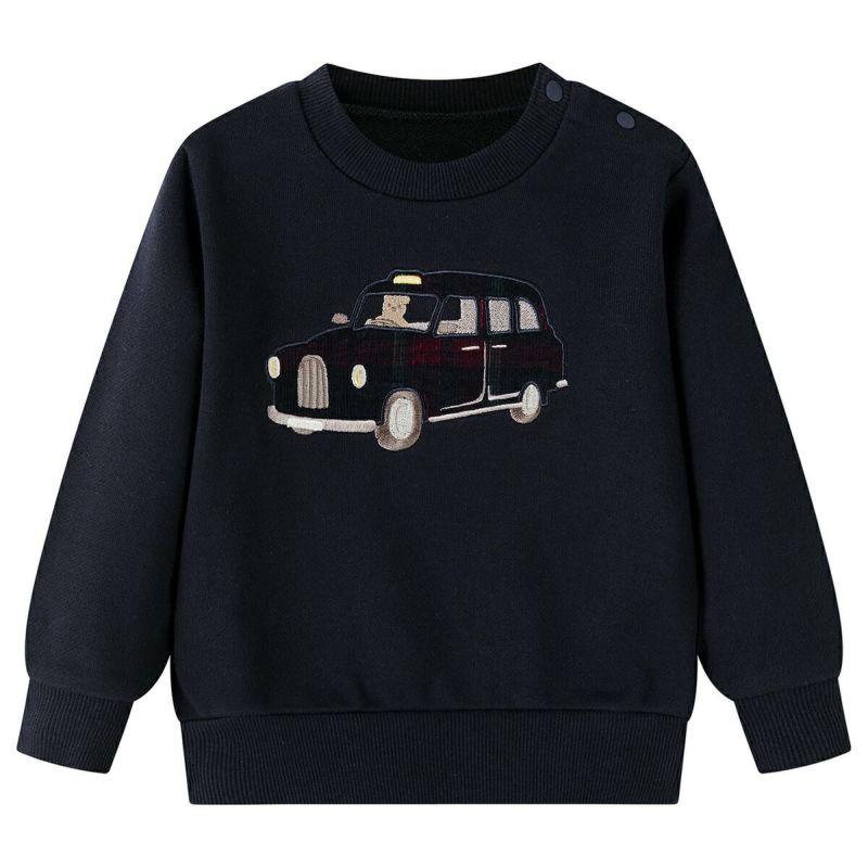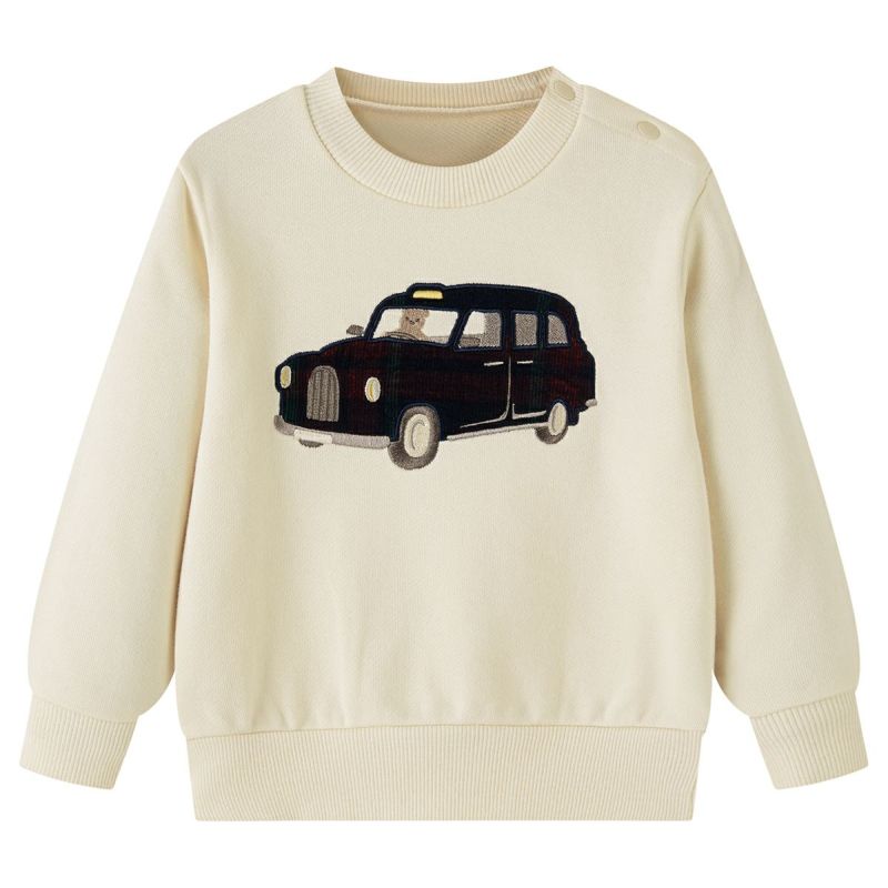 【柄】オリジナルチェックの生地を使ったロンドンタクシーのアップリケ刺しゅうを前見頃に大きくのせました。