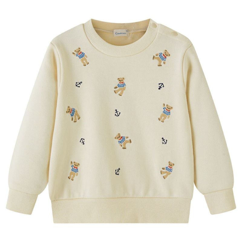 【柄】マリンスタイルに最適なクマ刺繍の総柄トレーナー。コーディネートしやすいアイボリーカラーで男女ともにおすすめです。
