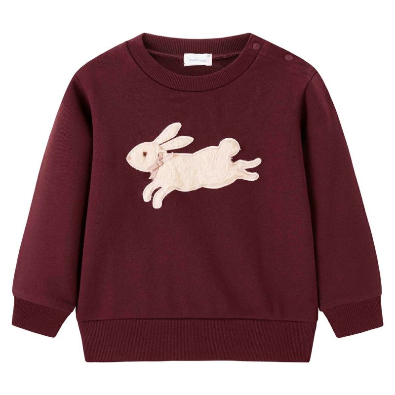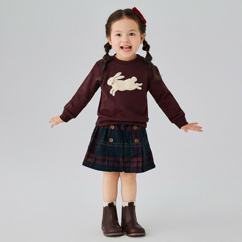 【柄】前身頃部分に大きなファー生地を使ったうさぎのアップリケ刺繍。やさしい色合いのピンクカラーと、秋冬らしいボルドーカラーの2色展開は、どちらのカラーも着回しが可能です。