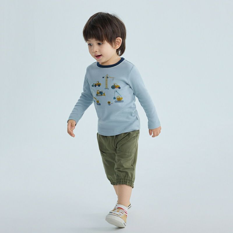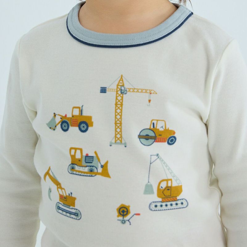 【柄】ブルドーザーやショベルカーなどの、キッズに人気の工事現場で働く車がモチーフとなったプリント。襟部分の配色バインダーが差し色となってTシャツのアクセントになっています。