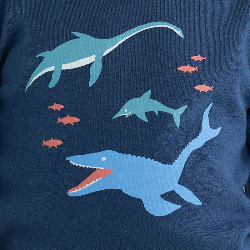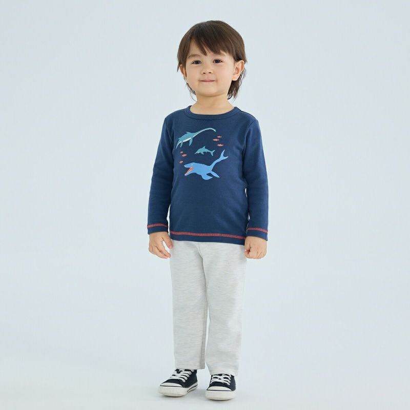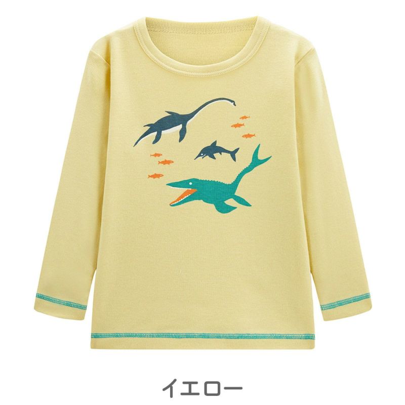 【柄】恐竜好きのキッズにピッタリなモササウルスやエラスモサウルス、イクチオサウルスの海竜シリーズのプリント柄。袖口と裾には配色の飾りステッチを入れて、1枚で着ても存在感のあるTシャツのポイントになっています。
