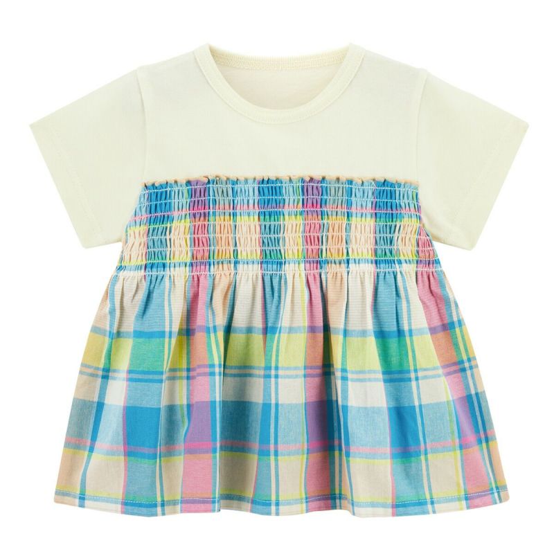 【素材】コンビミニ、オリジナルの先染めマドラスチェック柄は、さらっとした綿100%素材です。切り替えた無地部分は、夏らしい通気性の良い薄手のストレッチカノコ素材を使用しました。