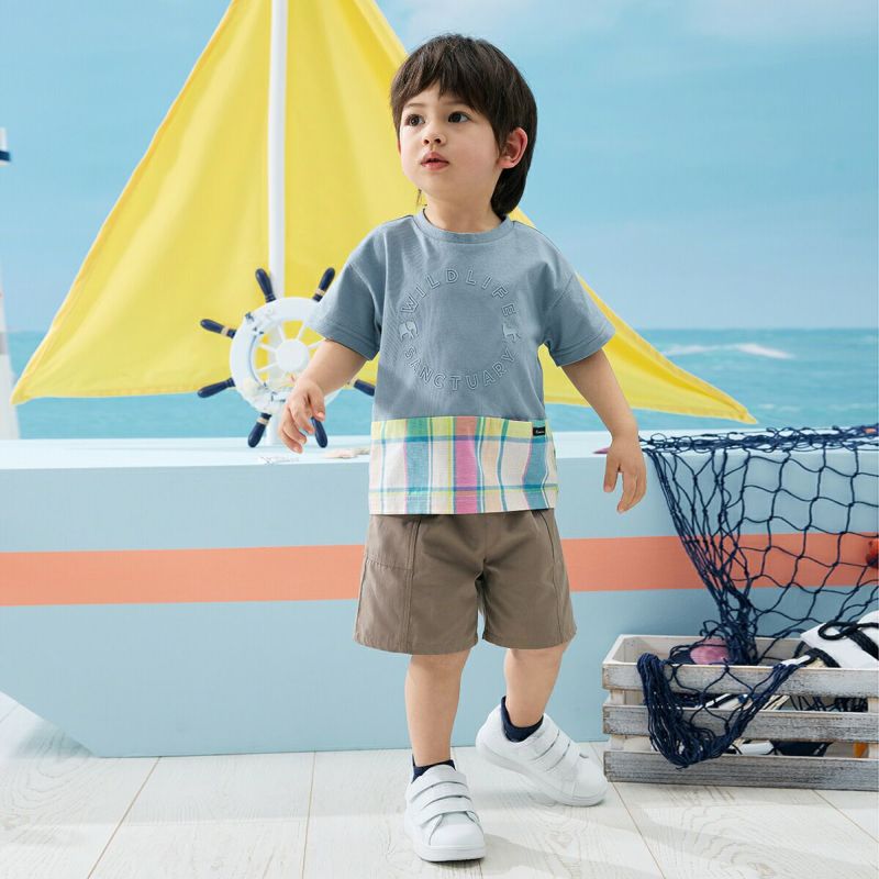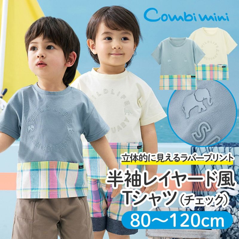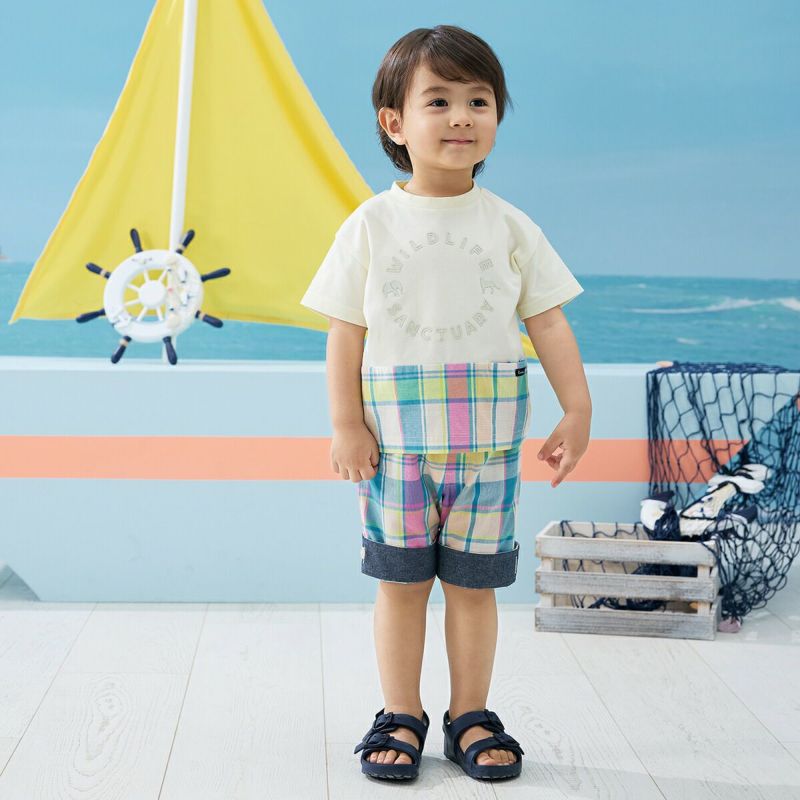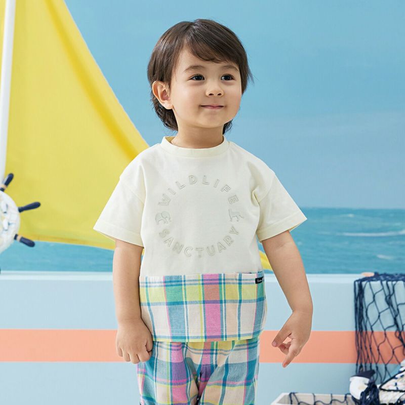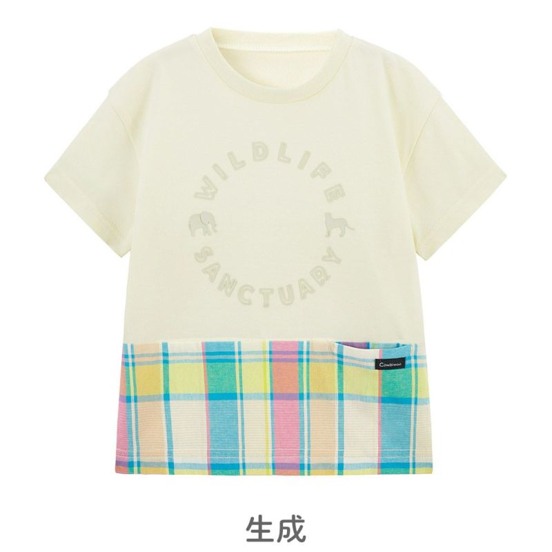 【柄】胸部分には、ぞうとチーターのポイントが入った、立体的に見えるラバープリントを施し、主張しすぎないように身生地同系色でオシャレ感を演出。前身裾部分のオリジナルチェックは、夏らしい明るくキレイな色合いがポイントで、全体の雰囲気を上品な印象にします。