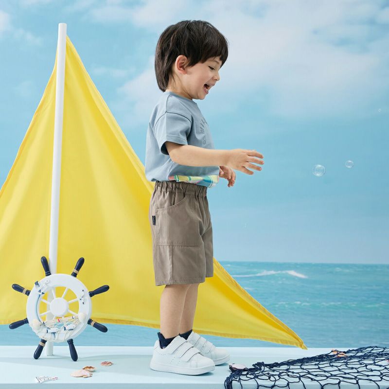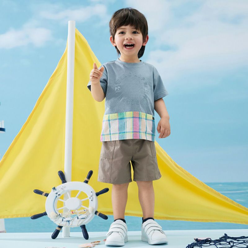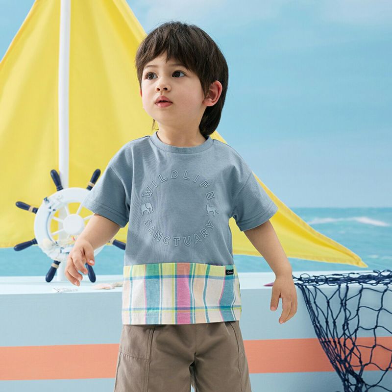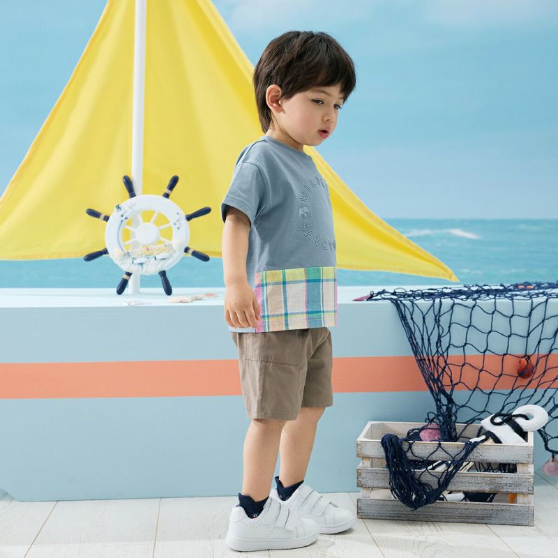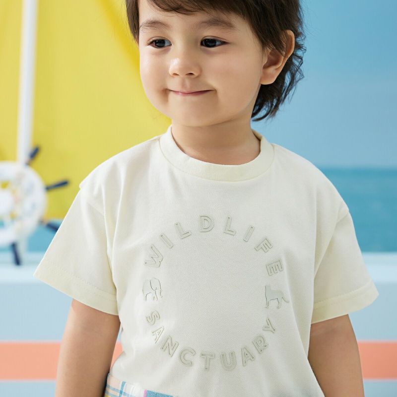 【柄】胸部分には、ぞうとチーターのポイントが入った、立体的に見えるラバープリントを施し、主張しすぎないように身生地同系色でオシャレ感を演出。前身裾部分のオリジナルチェックは、夏らしい明るくキレイな色合いがポイントで、全体の雰囲気を上品な印象にします。