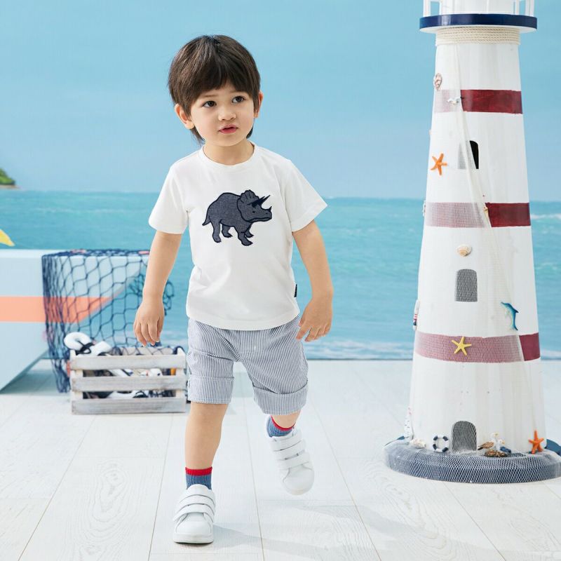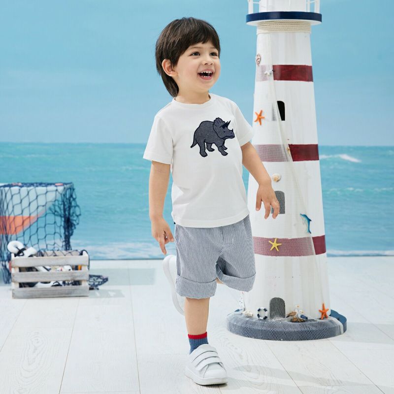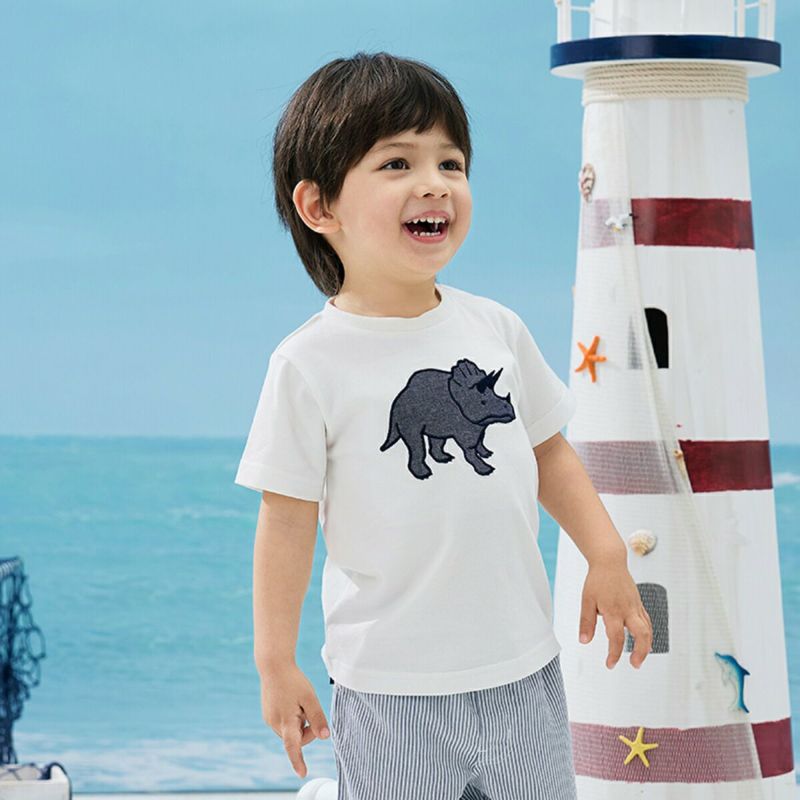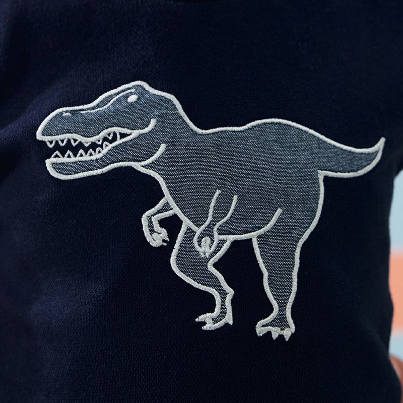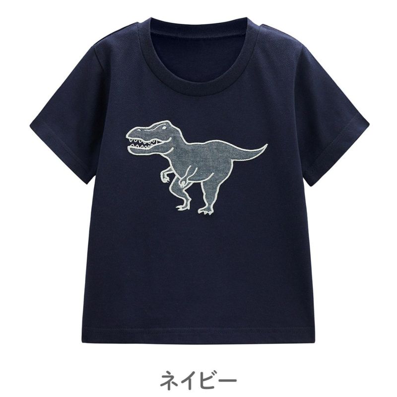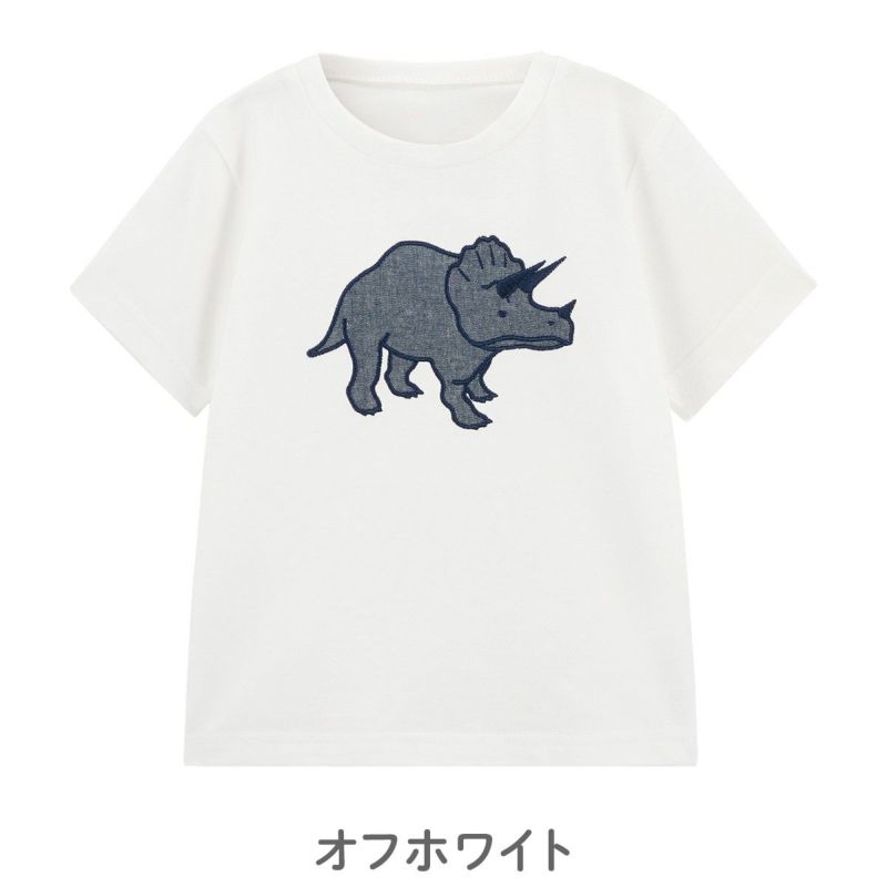 【柄】キッズに人気の恐竜シリーズ。ホワイトにはトリケラトプス、ネイビーにはT-Rexをダンガリー生地を使ったアップリケ刺繍で、かっこよく表現しました。恐竜たちが、今にも動き出しそうな躍動感際立つインパクトのあるTシャツです。
