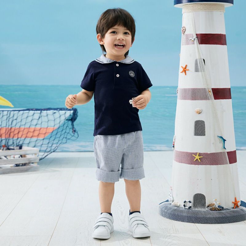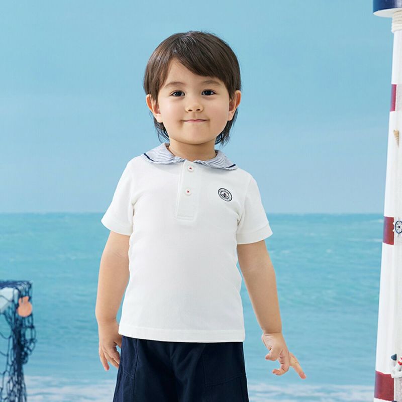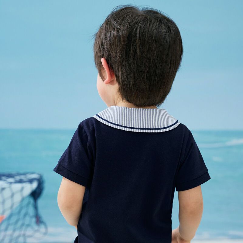 【仕様】衿にはアクセントでグログランテープを付け、ボタン付け糸は赤色の配色糸を使用し、細かいところまで気を配りました。この一枚で夏のマリンスタイルが完成する、衿付きのプルオーバータイプのシャツです。ボタン付きで脱ぎ着もしやすい仕様にしました。