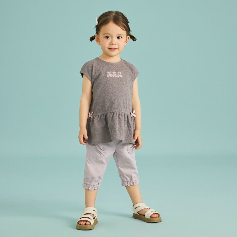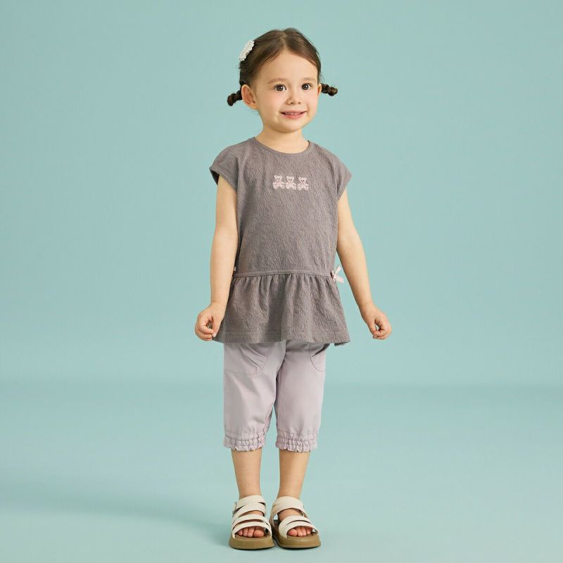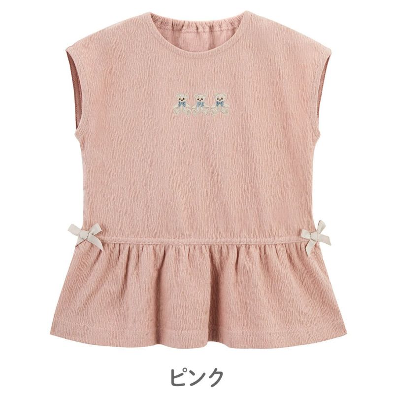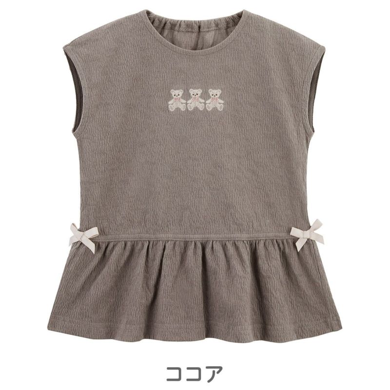 【仕様】後衿ぐりにはゴムを入れて着脱がしやすいチュニックにしました。ローウェストで切り替えたフリルがキュートな印象です。両サイドには飾りリボンをワンポイントで取り入れ、かわいらしさを演出しました。