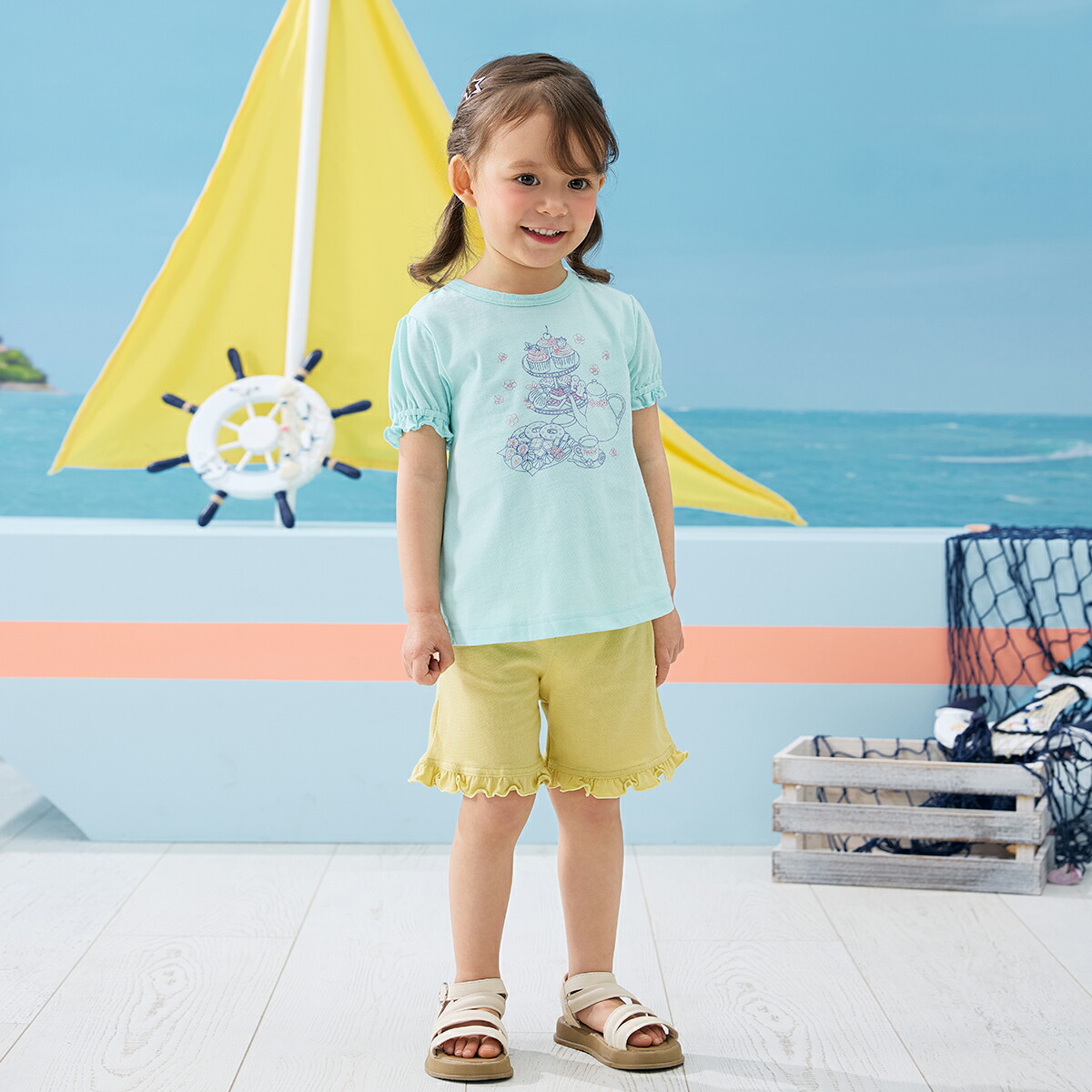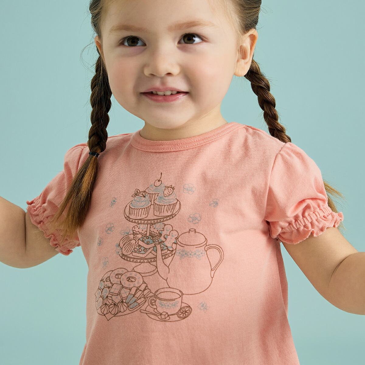 【柄】大人っぽいブルーとかわいらしいピンクの2色展開で、前身頃のティーパーティーをイメージしたプリントが女の子らしさを引き立てます。