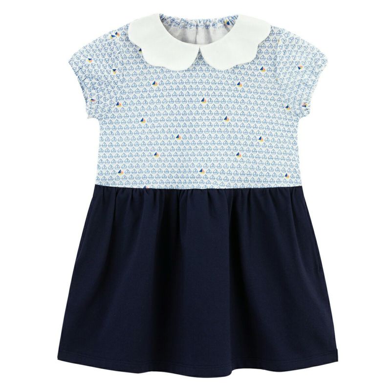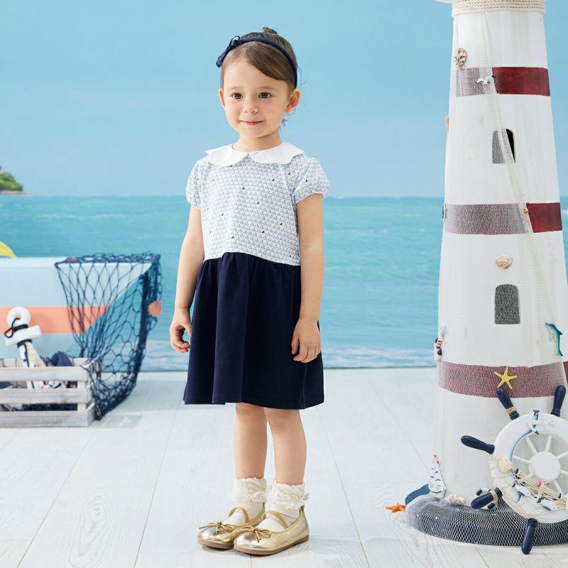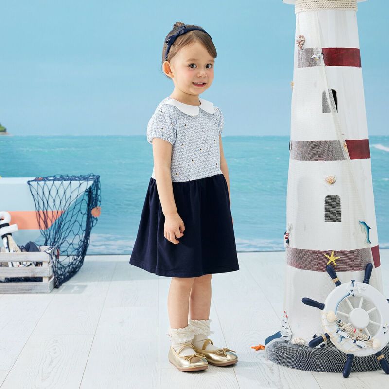 【柄】マリンテイストの小さいヨットの総柄に、アクセントで入れたピンクやイエロー、ブルーの差し色が華やかさを演出。スカート部分を表情のある無地カノコ素材で切り替えることで、大人っぽい印象に仕上げました。