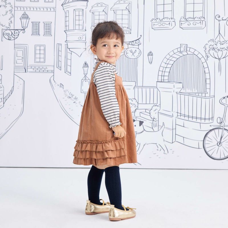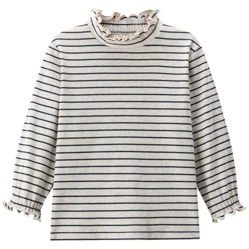 【仕様】シャーリングフリルが使われた襟部分がポイントの長袖Tシャツ。インナーとして襟元を出すレイヤードスタイルも楽しめるので着回しの幅が広がります。袖部分もギャザー仕様になっていて女の子らしさを引き立てます。また、伸縮性もあるので脱ぎ着しやすく重宝する一品です。