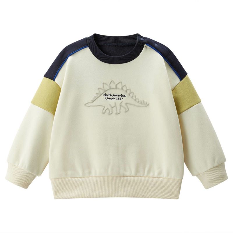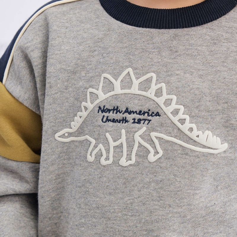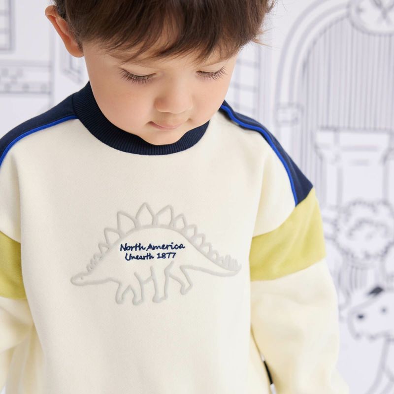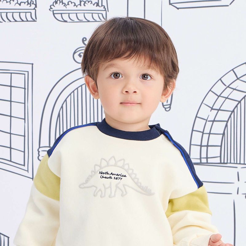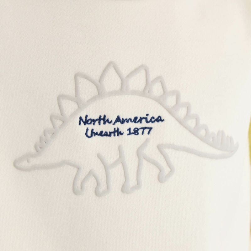 【カラー】ベースカラーは合わせやすいアイボリーと杢グレーの2色展開で、キッズに人気のステゴザウルスを立体的に見えるように発砲プリントで前身頃に大きく入れました。中心の文字部分は刺繍で表現し高級感を演出。