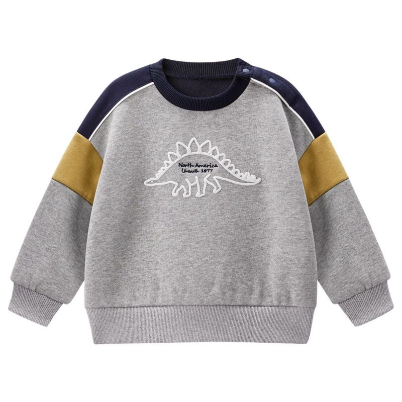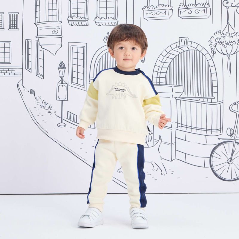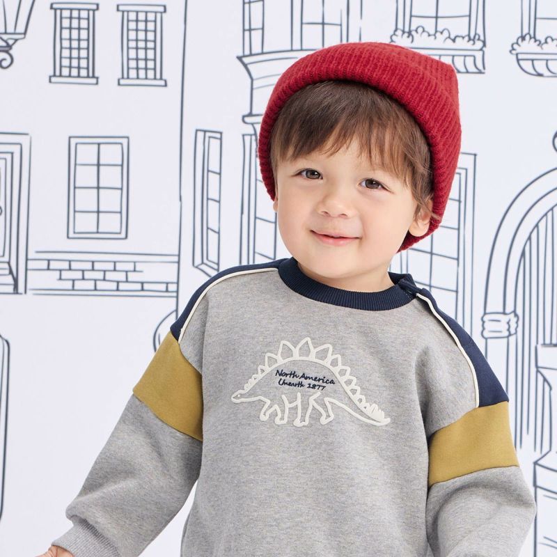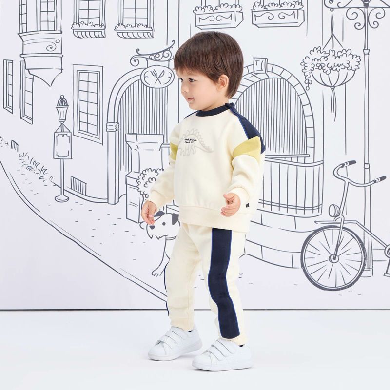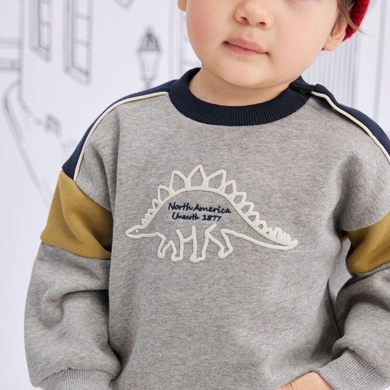 【カラー】ベースカラーは合わせやすいアイボリーと杢グレーの2色展開で、キッズに人気のステゴザウルスを立体的に見えるように発砲プリントで前身頃に大きく入れました。中心の文字部分は刺繍で表現し高級感を演出。