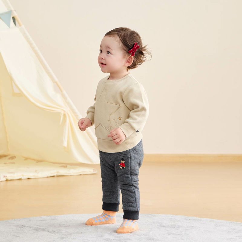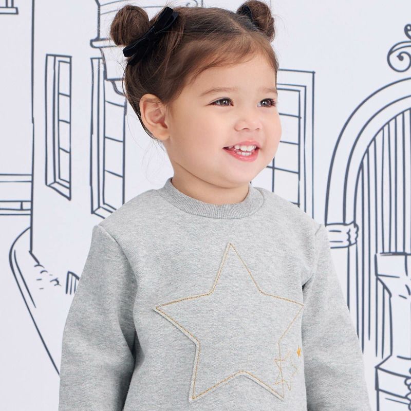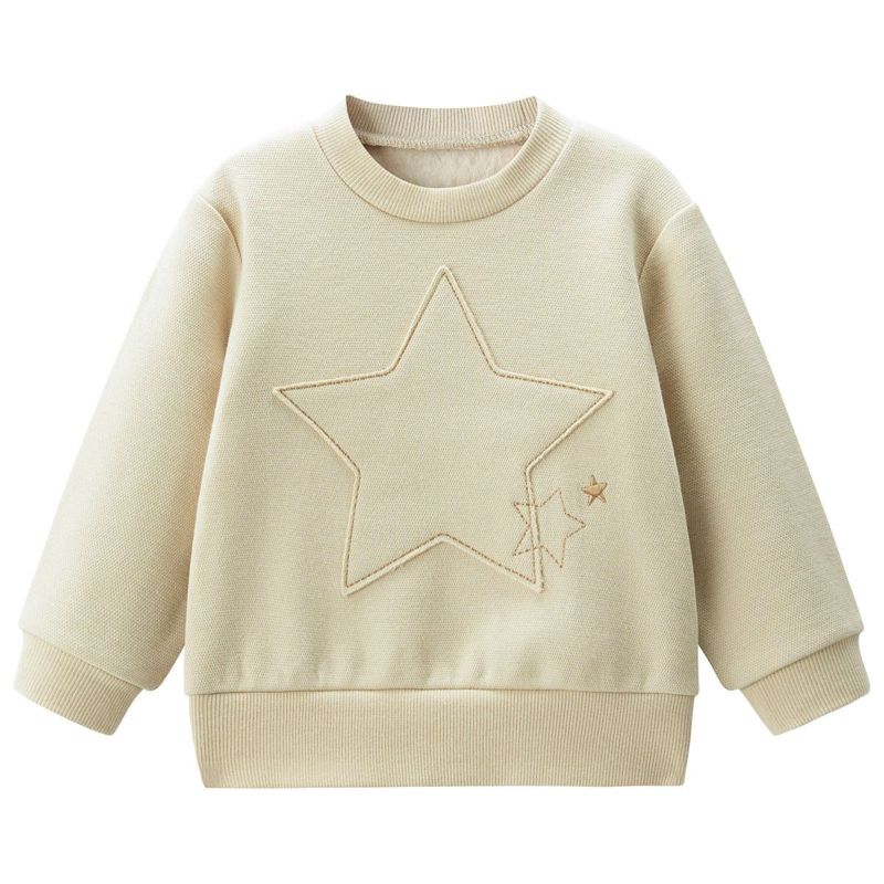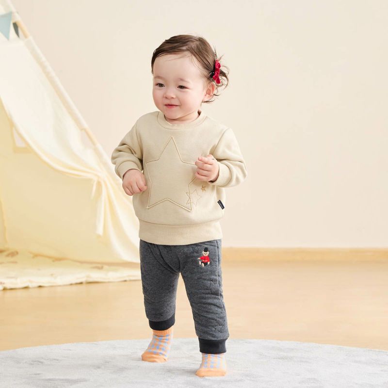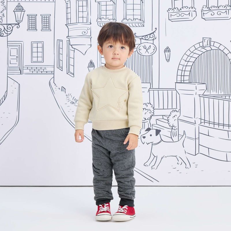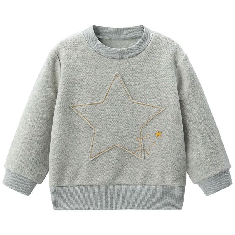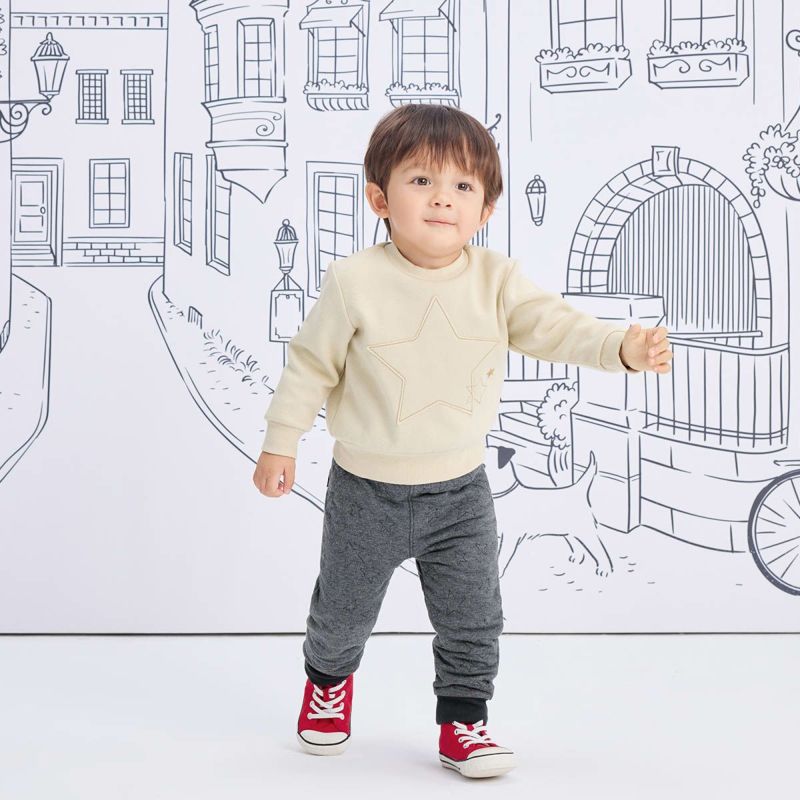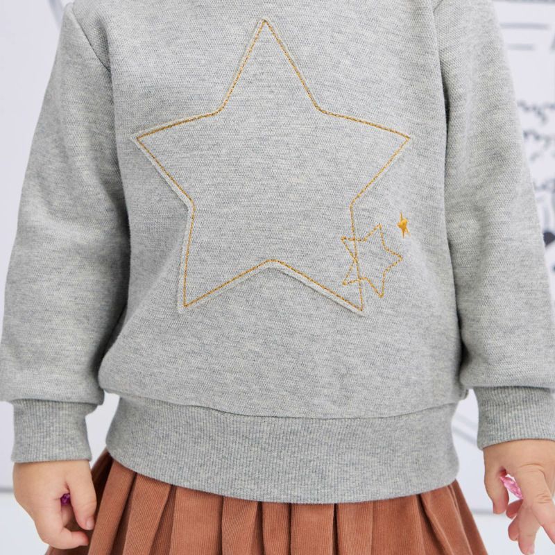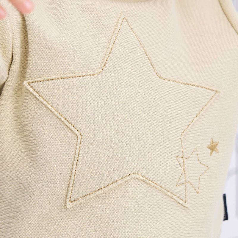 【カラー】前身頃に主張しすぎない大きい星のアップリケ刺繍が入った、コーディネートしやすいシンプルなトレーナー。カラー展開もライトベージュと杢グレーでお手持ちのボトムスなどにも合わせやすいです。
