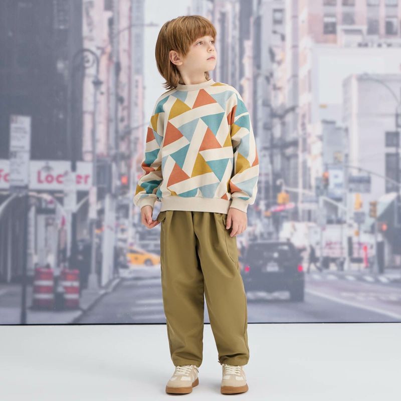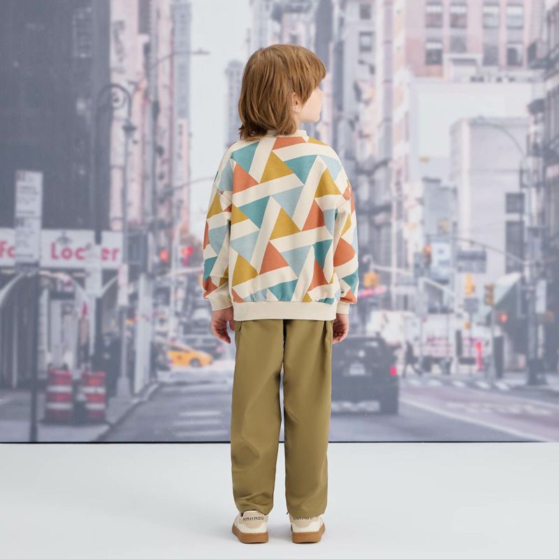【柄】秋冬らしい色合いが目を引く幾何学柄のプリントが特徴、遠くから見てもパッと目立つトレーナーは存在感あふれる1枚になっています。