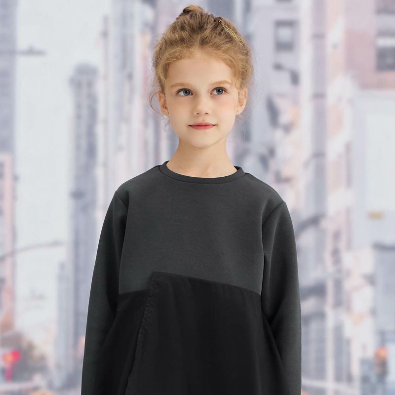 【仕様】アシンメトリーな切り替えが目を引くペプラムデザインのフレア部分にはブロード生地を使用。エレガントなシルエットが上品な印象を受けるトップスで、110~140サイズ展開です。
