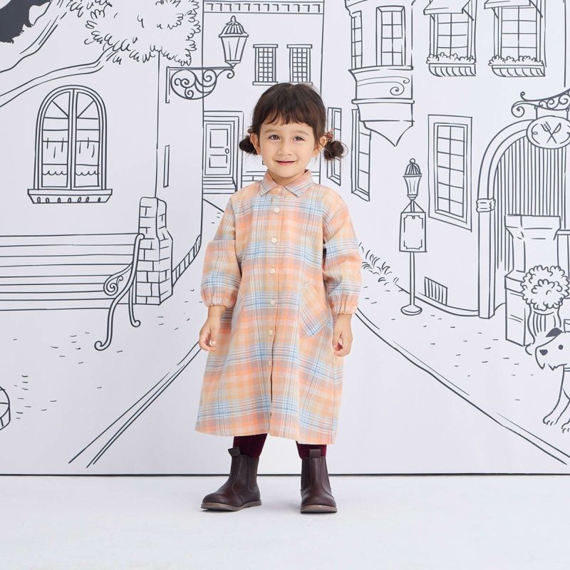 【仕様】膝が隠れるロング丈のシャツワンピースは前開き仕様で、袖口はゴム仕様なので脱ぎ着がカンタンにできます。前身頃には何かと便利なポケットを付けました。