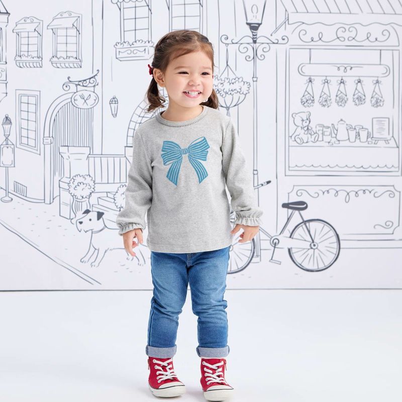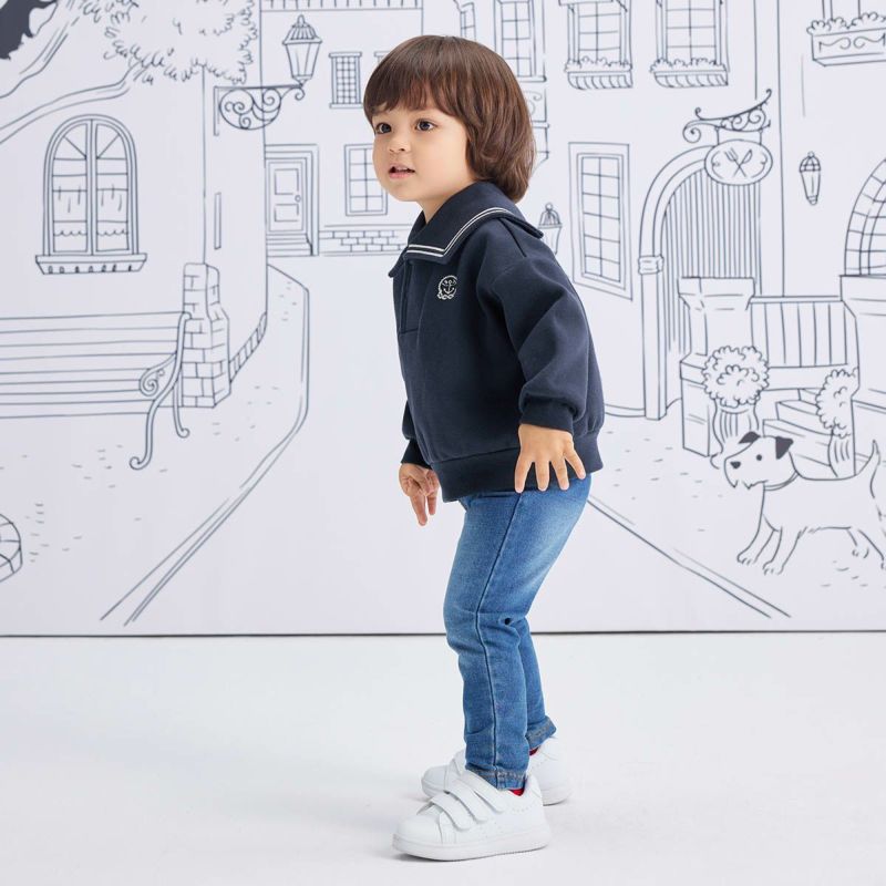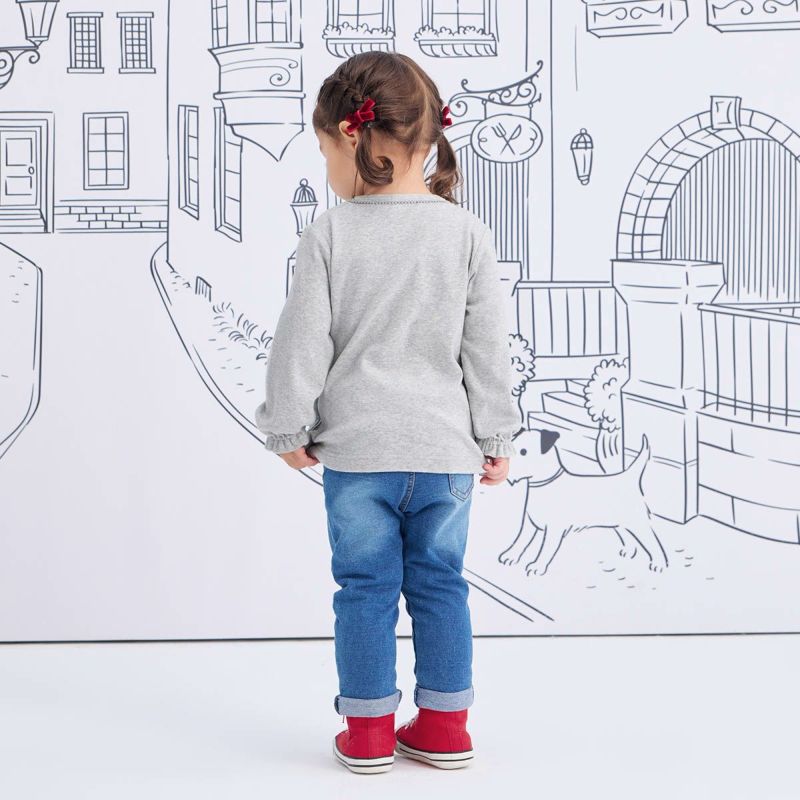 【素材】厚すぎず、伸縮性も兼ね備えた柔らかな風合いのデニムニット生地、動きやすく運動量の多い子供にも適した生地です。