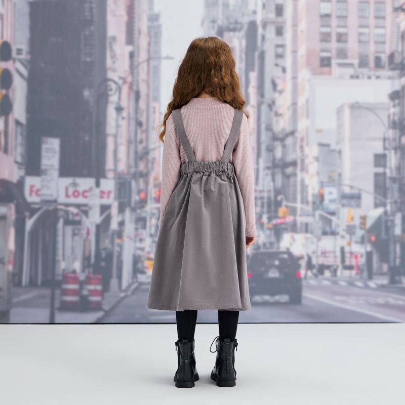 【仕様】肩ひもは2WAY仕様で長さを調節できます。また、後ウエストがゴム入りなので空き過ぎず適度なフィット感で着用時のストレスが軽減。両脇には何かと重宝するポケット付きで、ウェストのタックが裾に向かってのボリュームのあるフレア感を演出。110~140サイズ展開です。