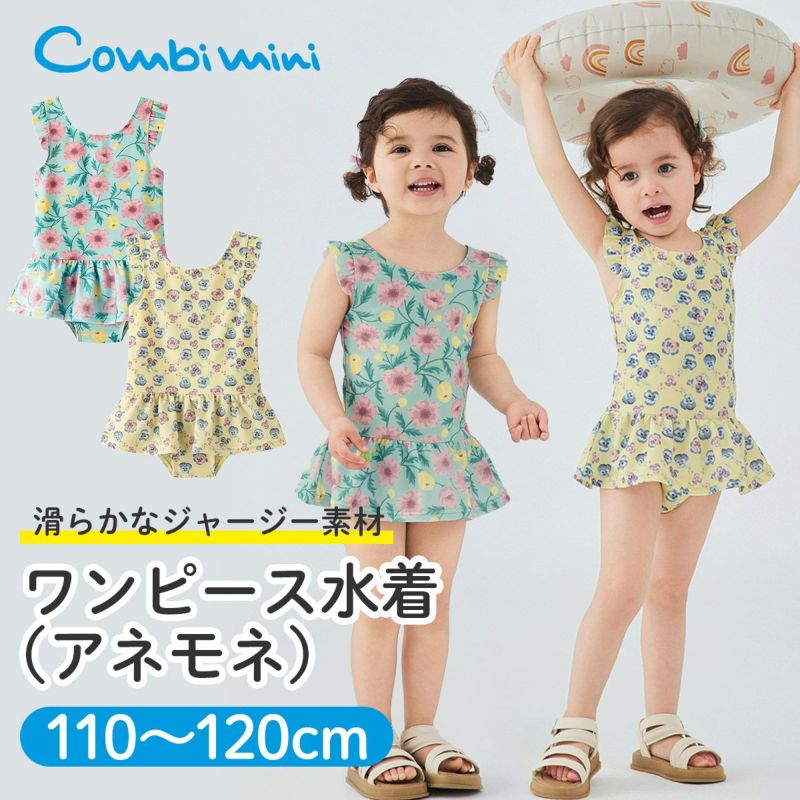 キュートでかわいらしいライトイエローのビオラ柄と、ブルーグリーンにピンクとイエローの花が映える少し大人気分のアネモネ柄のワンピース水着。肩フリルと後リボンが女の子らしさを更に演出。伸縮性のある滑らかなジャージー素材で、透け防止のため前身頃とパンツ股部分は裏地付き。※サイズはジャストサイズのものをお選び下さい。