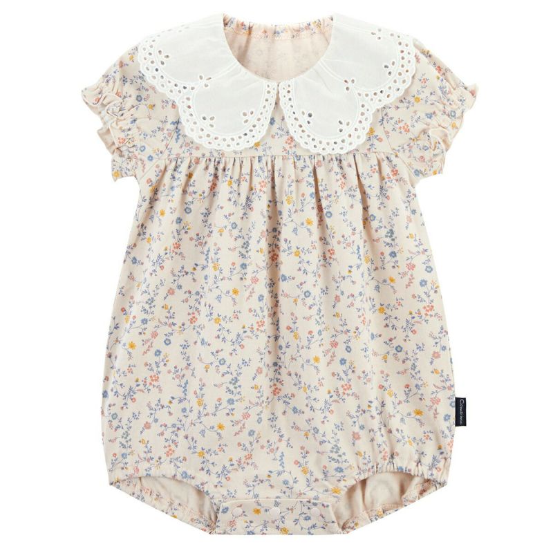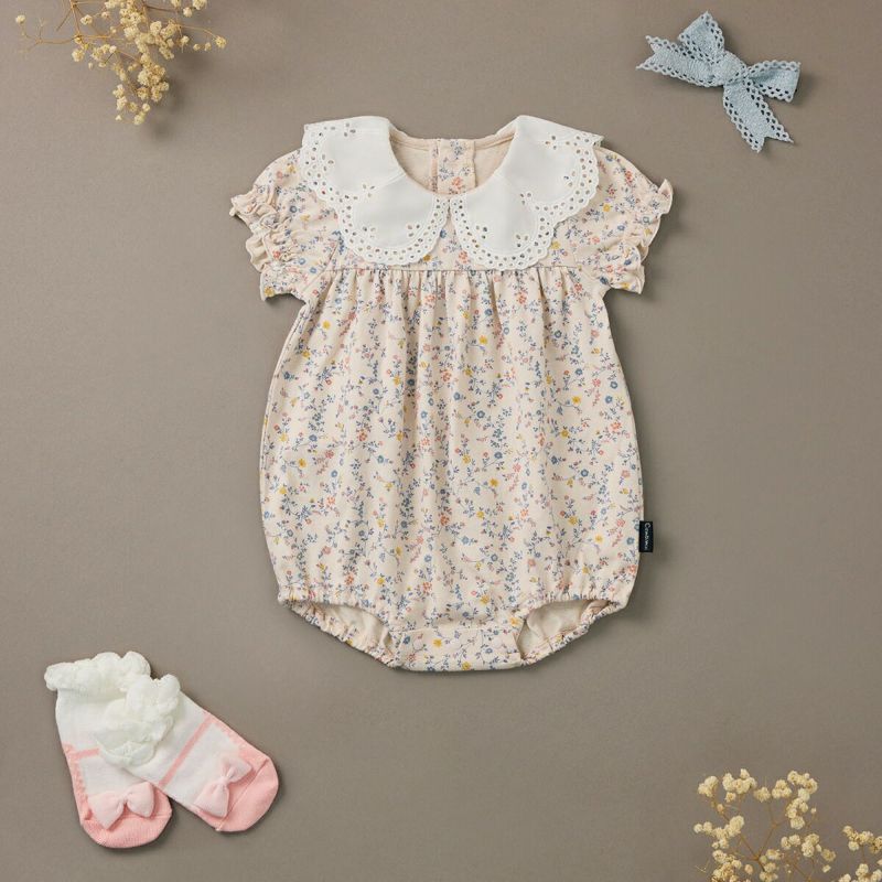 【仕様】大きな可愛らしい綿レースの衿が特徴で、上品な小花柄ともマッチし、お出かけ着としても活躍する、ゆったりシルエットのボディTシャツです。着脱時のストレスを軽減するために後開き仕様にしています。ギフトとしても喜ばれる一品です。 【備考】裾ゴム仕様