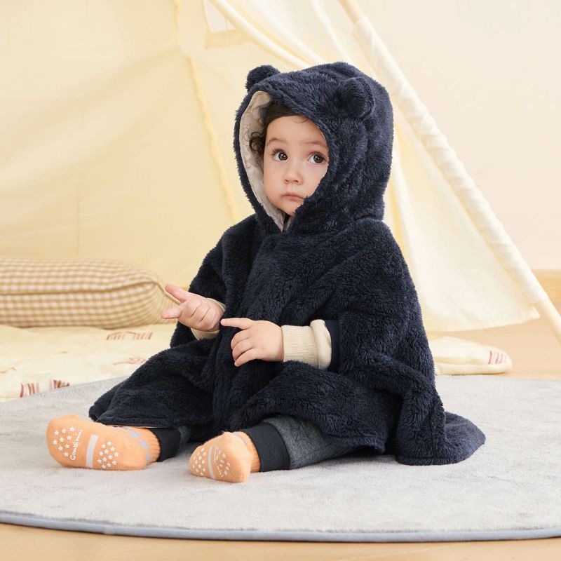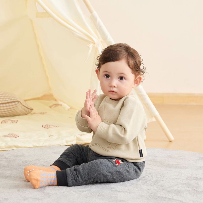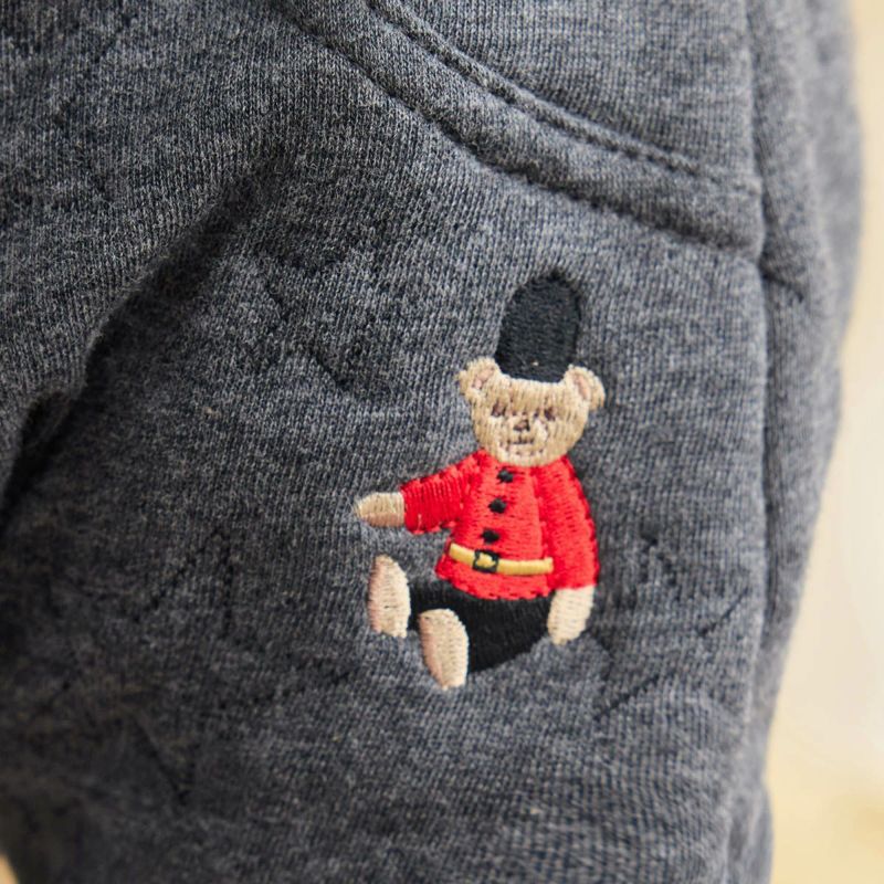 【柄】生地同系色で目立ち過ぎない星柄がコーディネートもしやすくオシャレで特徴的なあったか素材。前身頃のキッズパンツとお揃いのロンドンベア刺繍のワンポイントが上品さも演出します。