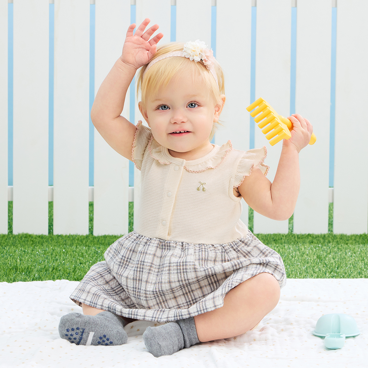 本体/綿95%ポリウレタン5%(ストレッチワッフル)、衿部分/綿100%(フライス)、スカート部分/綿60%ポリエステル40%(サッカーチェック)