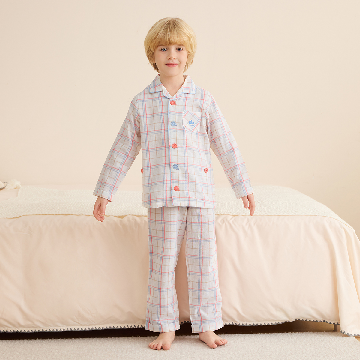 【柄】コンビミニ定番の先染めチェック柄が、爽やかなパステルマリンカラーで登場。シーズン問わず男女ともにおススメで、同素材同柄のママ用パジャマもご用意していますので親子でのお揃いが楽しめます。また、お客様の声にお答えして同柄同素材の150cmジュニアサイズパジャマを「コンビミニ公式ストア」にて先行販売しております。是非ご覧くださいませ。(長袖ママパジャマ品番