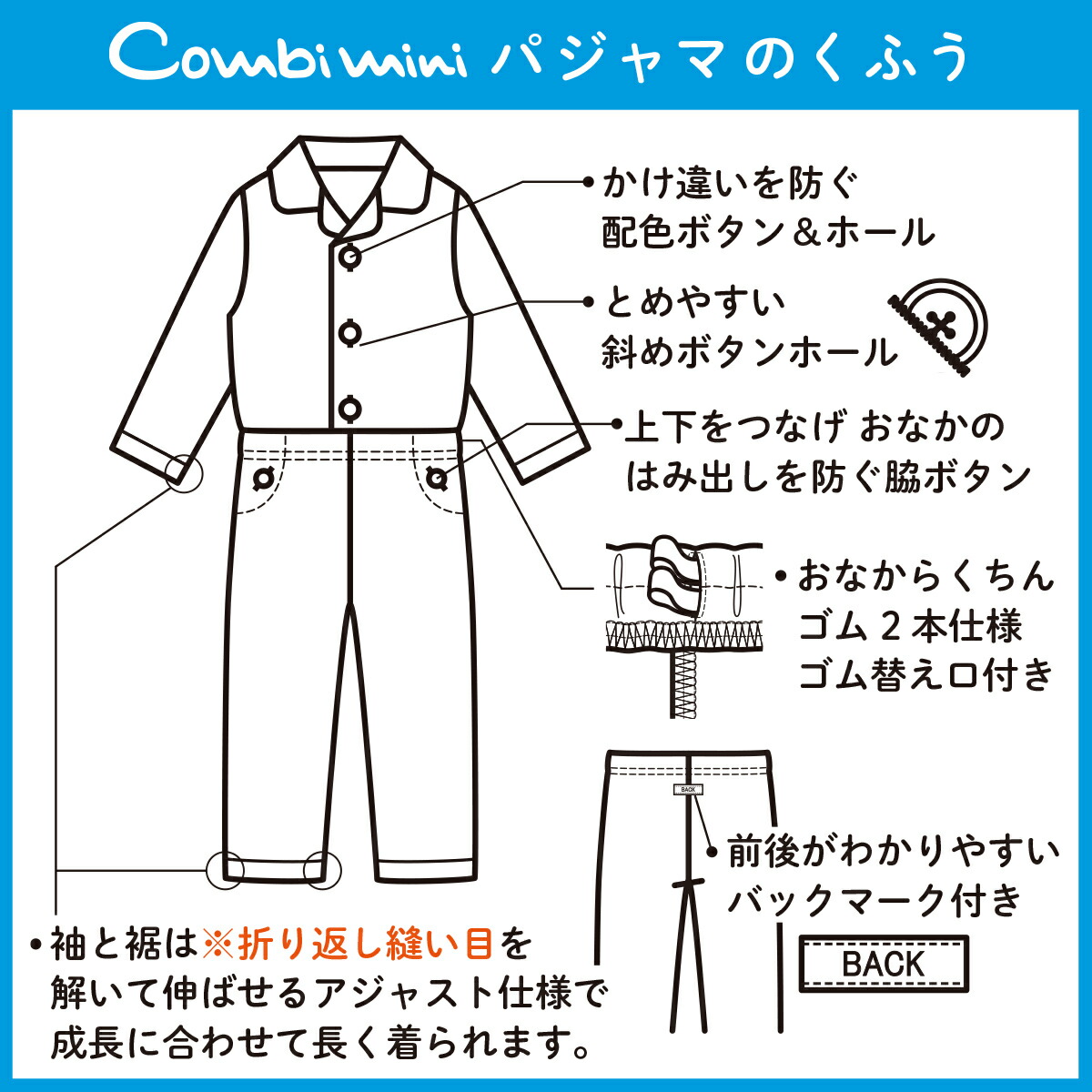 【仕様】上質感のある前開き襟付き仕様。コードパイピングとポケットのくじら刺繍がアクセントになっています。(ママサイズに刺繍はございません)コンビミニのパジャマは一人でお着替えの練習ができる工夫が満載。かけ違いを防ぐ配色ボタン&ホール。大き目のボタンで掴みやすく留めやすい斜めボタンホール。前後がわかりやすいBACKマーク付き。また、上下をつなぐおなかのはみ出しを防ぐ脇ボタンもうれしい機能(おなか安心ボタン)