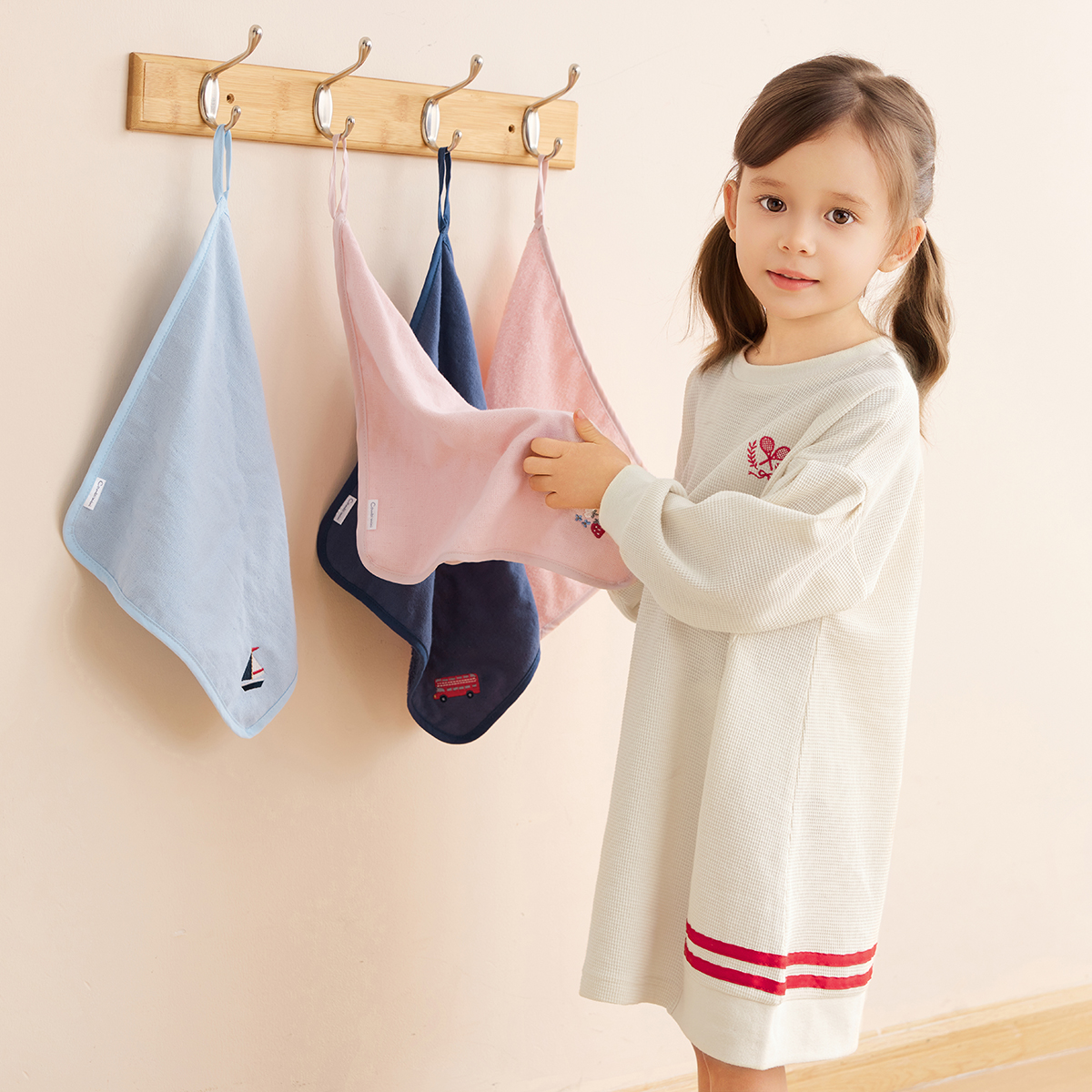 【仕様】保育園や幼稚園で必需品のループ付きタオル2枚組は、指定されやすい30cm×30cmの正方形サイズになっていてデイリーに活躍すること間違いなし。