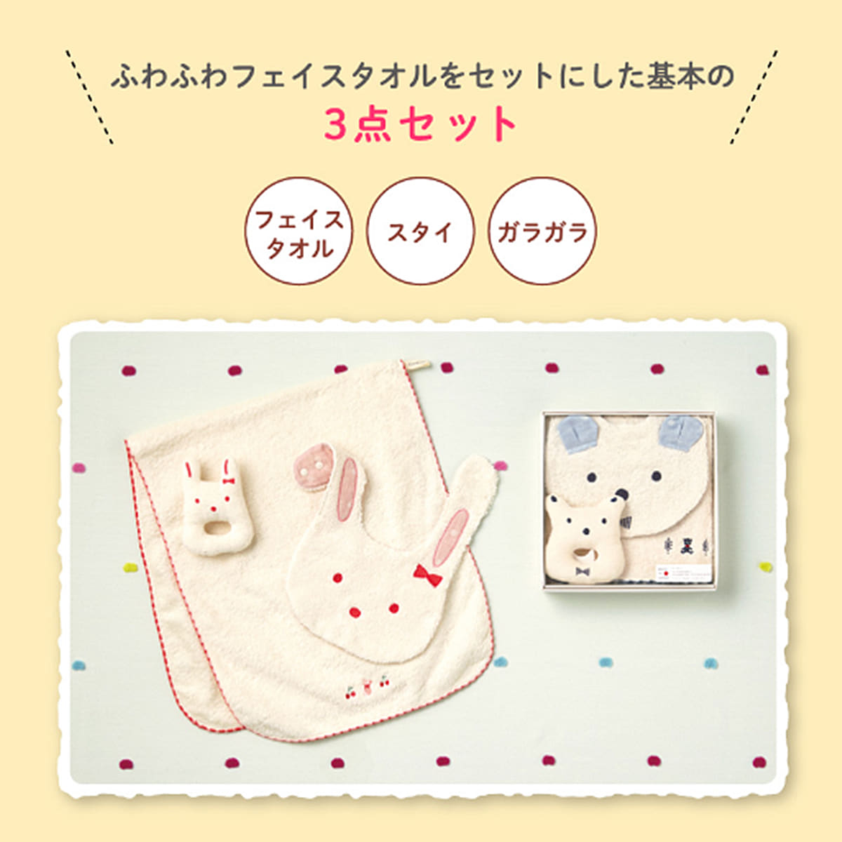 日本製。セット詳細/タオル縦:80×横34cm、スタイ:横19×総丈30cm、ガラガラ:レッド縦11.5×横8.5cm・ネイビー縦9.5×横8.5cm