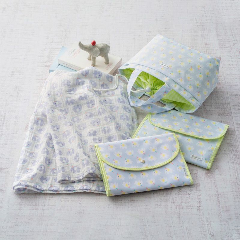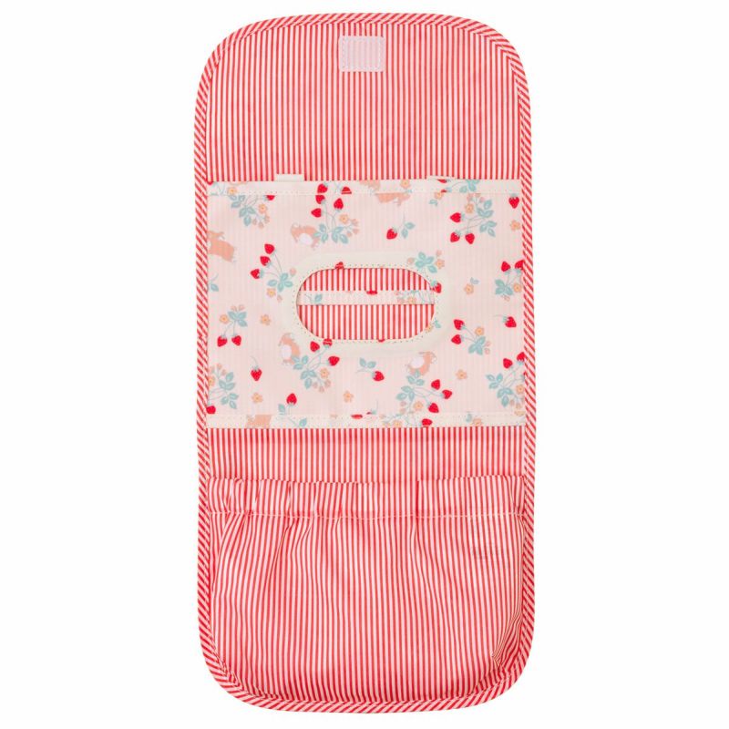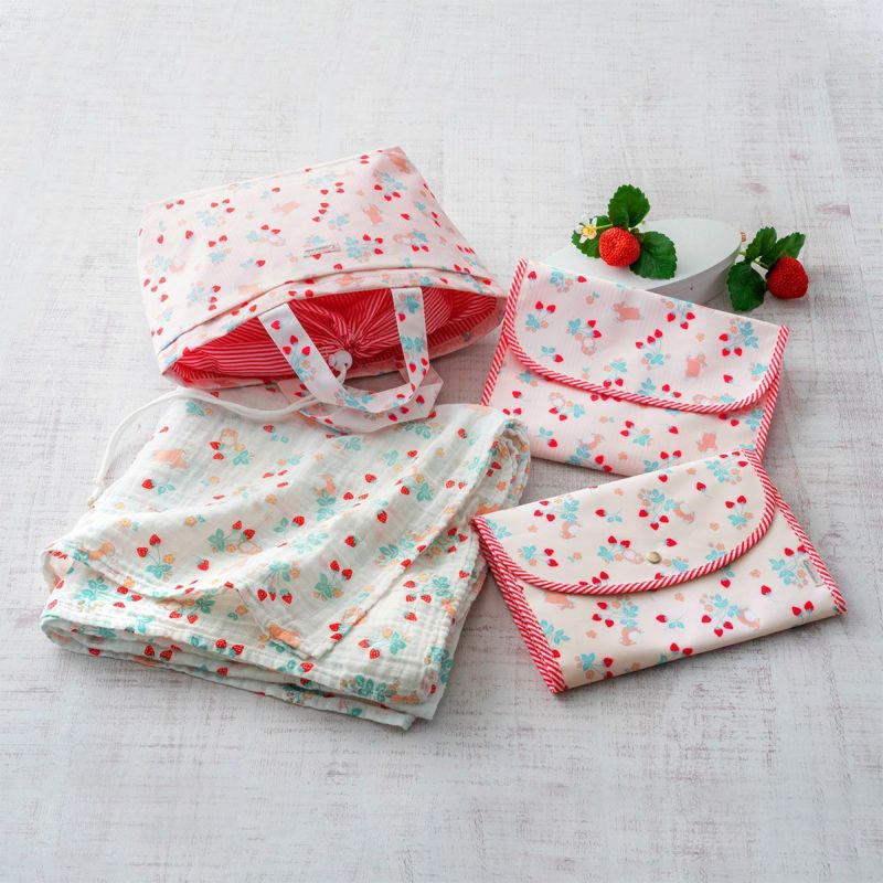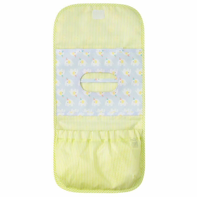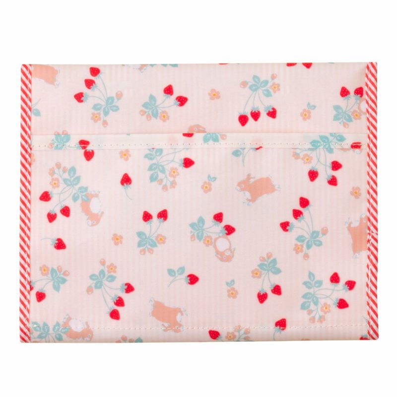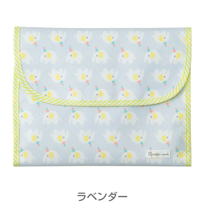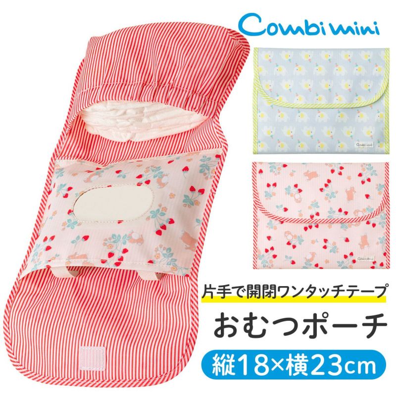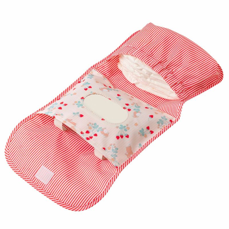 三角帽子をかぶった可愛らしいぞう柄と、キュートないちご&うさぎ柄の2柄から選べるおむつポーチ。片手でも開閉しやすいようにふたはワンタッチテープで留める仕様です。おしりふき収納ポケット付きで、おむつは4~6枚程度入ります。