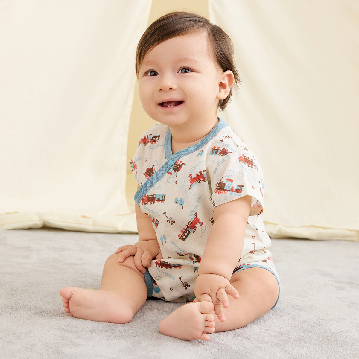 【柄】やさしい色合いのクリームは、元気に走り回る汽車が子供らしい総柄。汎用性の高いかわいらしいデザインなので、ちょっとしたおでかけや、おうちでのゴロゴロ時間やベビーパジャマとしてもお使いいただけます。ベビーギフトとしてもおススメです。キッズサイズのパジャマも同柄でご用意していますので兄弟でお揃いが楽しめます。(キッズパジャマ品番667253