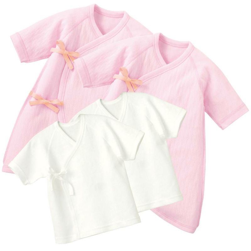 セット詳細/短肌着:50~60サイズ×2、コンビ肌着:50~60サイズ×2、短肌着は7分袖、脇シームレス仕様、コンビ肌着は外縫い仕様、かけ違い防止ボタン付き
