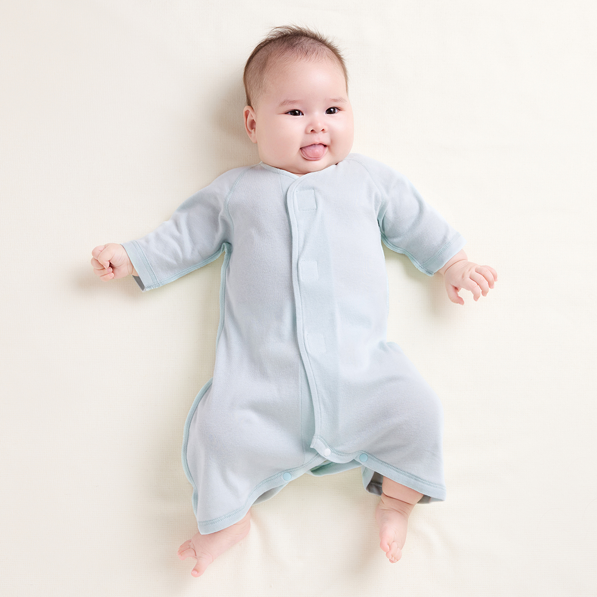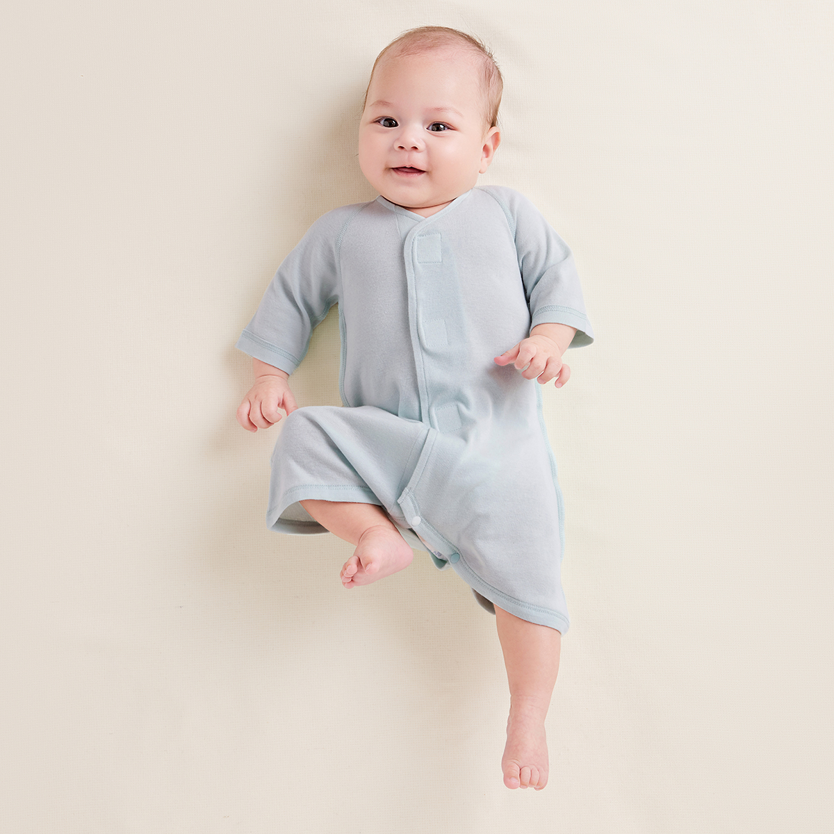 【仕様】「もっとかんたんにお着替えしたい」というママたちの声に応えて、ワンタッチテープ式のコンビ肌着が登場。足をバタつかせてもはだけない股下プランサー付きで、ワンタッチテープをさっとなでるだけで、素早くお着替えできます。内股中央のボタンは手ざわりと色を変えて、掛け違いを防止します。