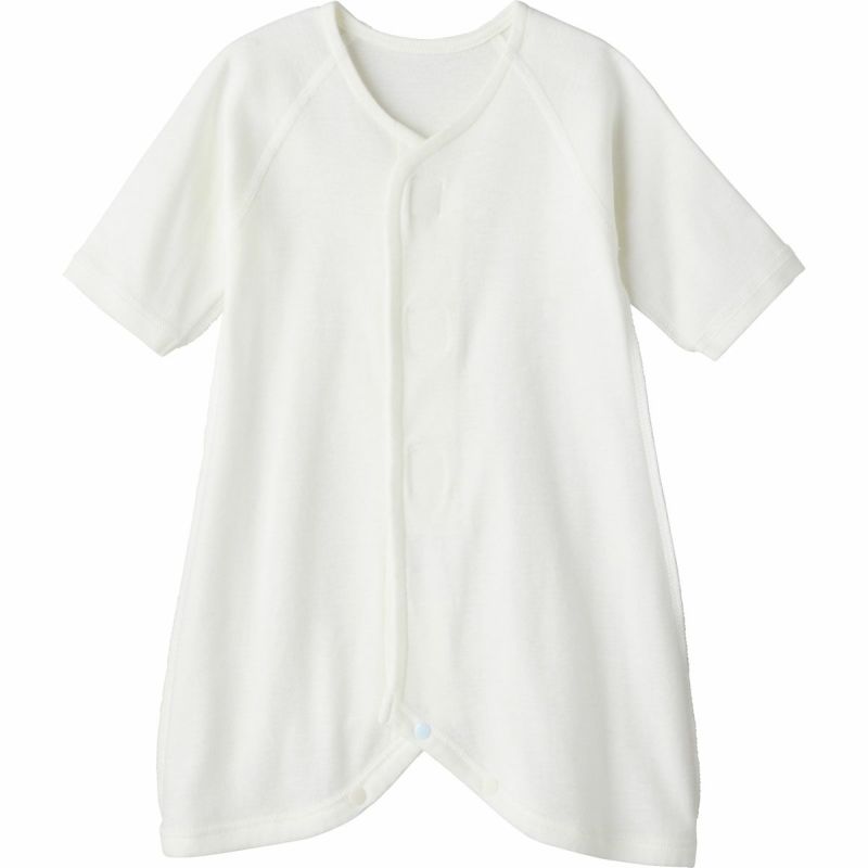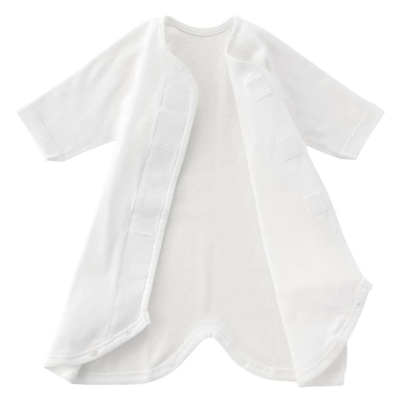 【仕様】「もっとかんたんにお着替えしたい」というママたちの声に応えて、ワンタッチテープ式のコンビ肌着が登場。内股中央のボタンは手ざわりと色を変えて、掛け違いを防止します。