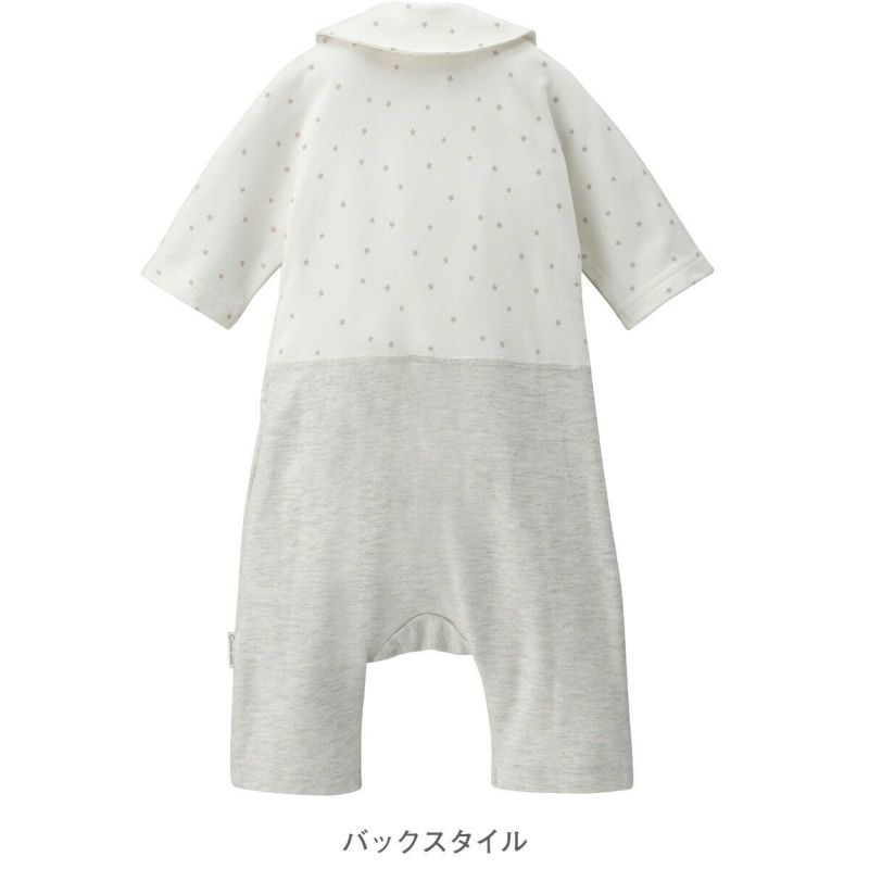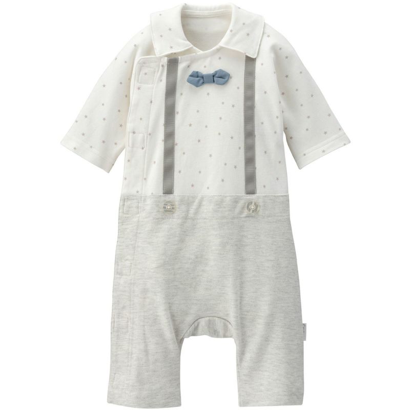 退院時などのセレモニーウェアとしておすすめな、フォーマルテイストのレイヤード風ラップクラッチ。襟や蝶ネクタイ、サスペンダー風グログランテープを施してきちんと感を高めました。トップス部分は小さな星柄プリントをちりばめた、肌に心地よくなめらかな綿100%スムース素材を使用。ボトム部分は鹿の子素材で変化を付けて、愛らしいベビー紳士のできあがり。
