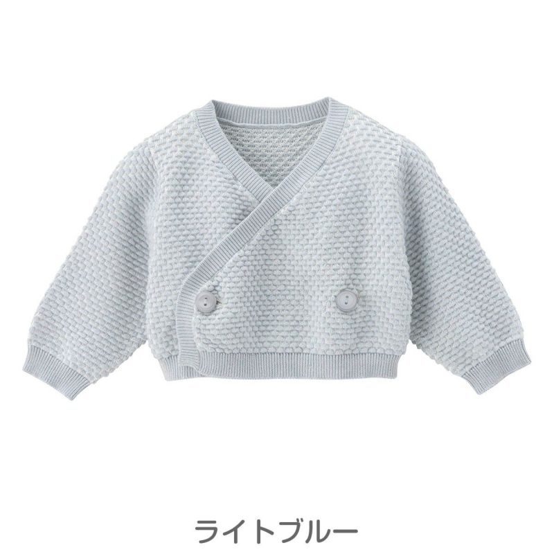 新生児から使える、セレモニーやおでかけ用アウターにもぴったりなニットボレロ。ポコポコと凹凸のある綿100%の編地と淡い色使いが、ニュアンスのある上質感を生んでいます。ゆったりとした袖や深い前合わせで、トレンドのエッセンスをプラス。男の子にも女の子にもおすすめで、3シーズン使える便利アイテムです。