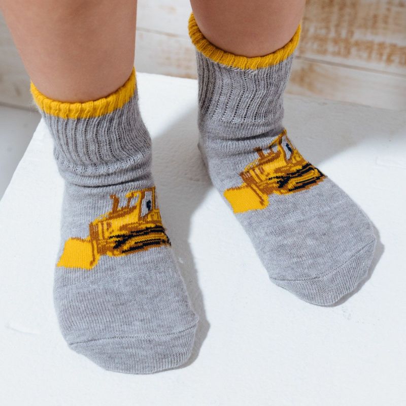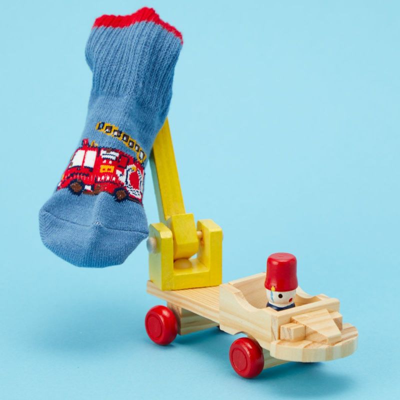 男の子に大人気な働く車をモチーフにしたシューフィットソックス。ブルーは消防車、杢グレーはブルドーザーが甲部分に登場します。つま先部分は厚地で敗れにくく、足裏の滑り止めなどキッズにうれしい工夫も満載。