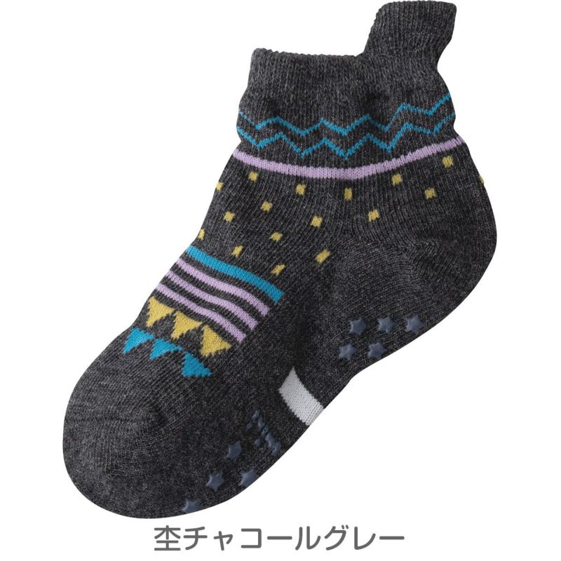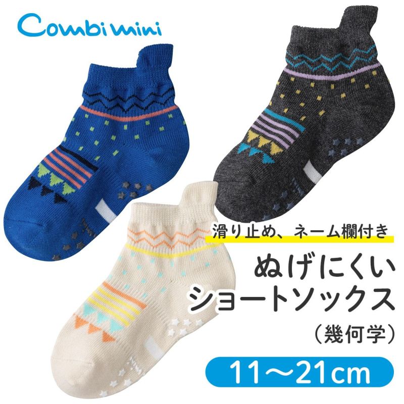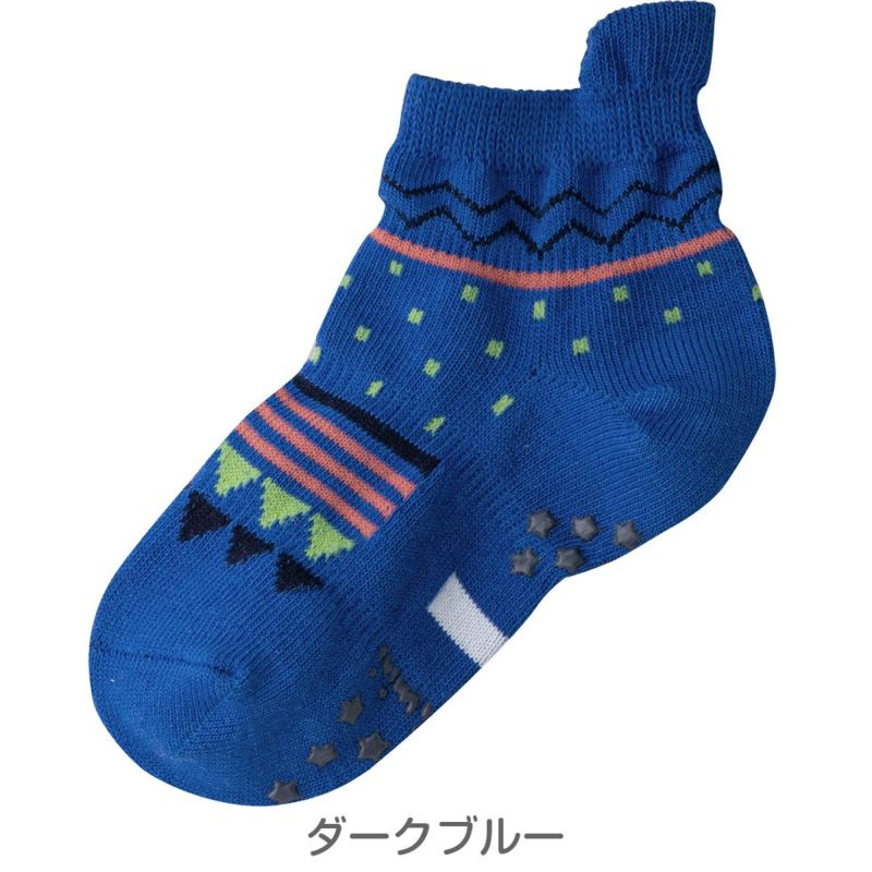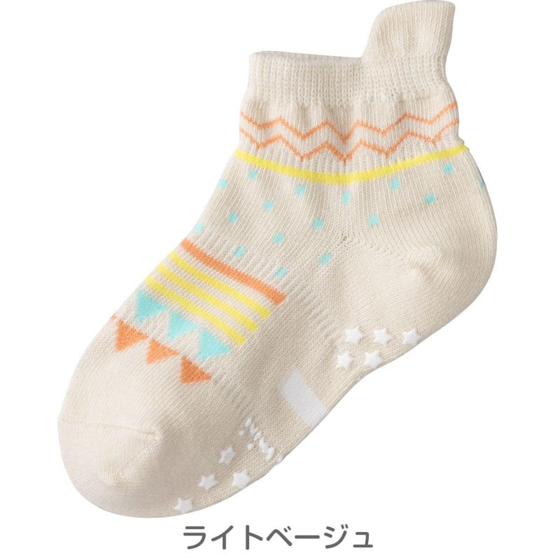 着脱に便利なベロ付きの、幾何学模様柄ショート丈ソックスです。足にしっかりフィットとして脱げにくいフィットスパン入りで、Y字ヒールと脱げにくい工夫もいっぱい。男の子にも女の子にもおすすめ。
