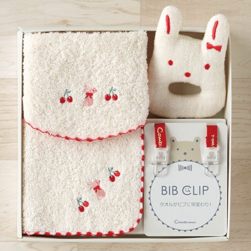 日本製。セット詳細/タオル:しかく縦23×横23cm・まる縦21×横21cm、スタイ:横19×総丈30cm、ガラガラ:レッド縦11.5×横8.5cm・ネイビー縦9.5×横8.5cm、クリップひも:14~25.5cm
